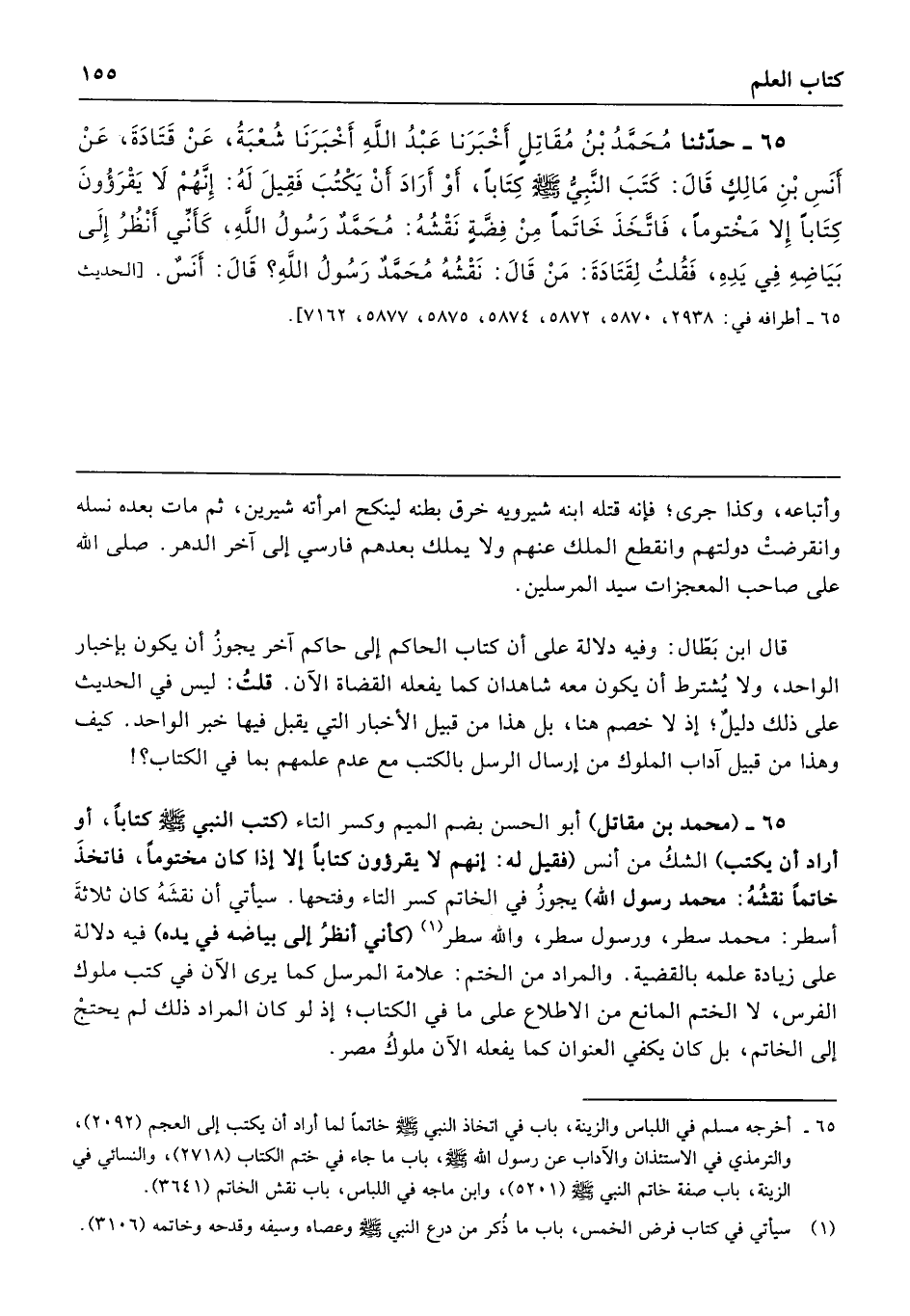 65 - حَدَّثَنَا مُحَمَّدُ بْنُ مُقَاتِلٍ أَبُو الحَسَنِ المَرْوَزِيُّ، أَخْبَرَنَا عَبْدُ اللَّهِ، قَالَ: أَخْبَرَنَا شُعْبَةُ، عَنْ قَتَادَةَ، عَنْ أَنَسِ بْنِ مَالِكٍ، قَالَ: كَتَبَ النَّبِيُّ صَلَّى اللهُ عَلَيْهِ وَسَلَّمَ كِتَابًا - أَوْ أَرَادَ أَنْ يَكْتُبَ - فَقِيلَ لَهُ: إِنَّهُمْ لاَ يَقْرَءُونَ كِتَابًا إِلَّا مَخْتُومًا، فَاتَّخَذَ خَاتَمًا مِنْ فِضَّةٍ، نَقْشُهُ: مُحَمَّدٌ رَسُولُ اللَّهِ، كَأَنِّي أَنْظُرُ إِلَى بَيَاضِهِ فِي يَدِهِ، فَقُلْتُ لِقَتَادَةَ مَنْ قَالَ: نَقْشُهُ مُحَمَّدٌ رَسُولُ اللَّهِ؟ قَالَ أَنَسٌ. [الحديث 65 - أطرافه في: 2938 - 5870 - 5872 - 5874 - 5857 - 5877 - 7162].
