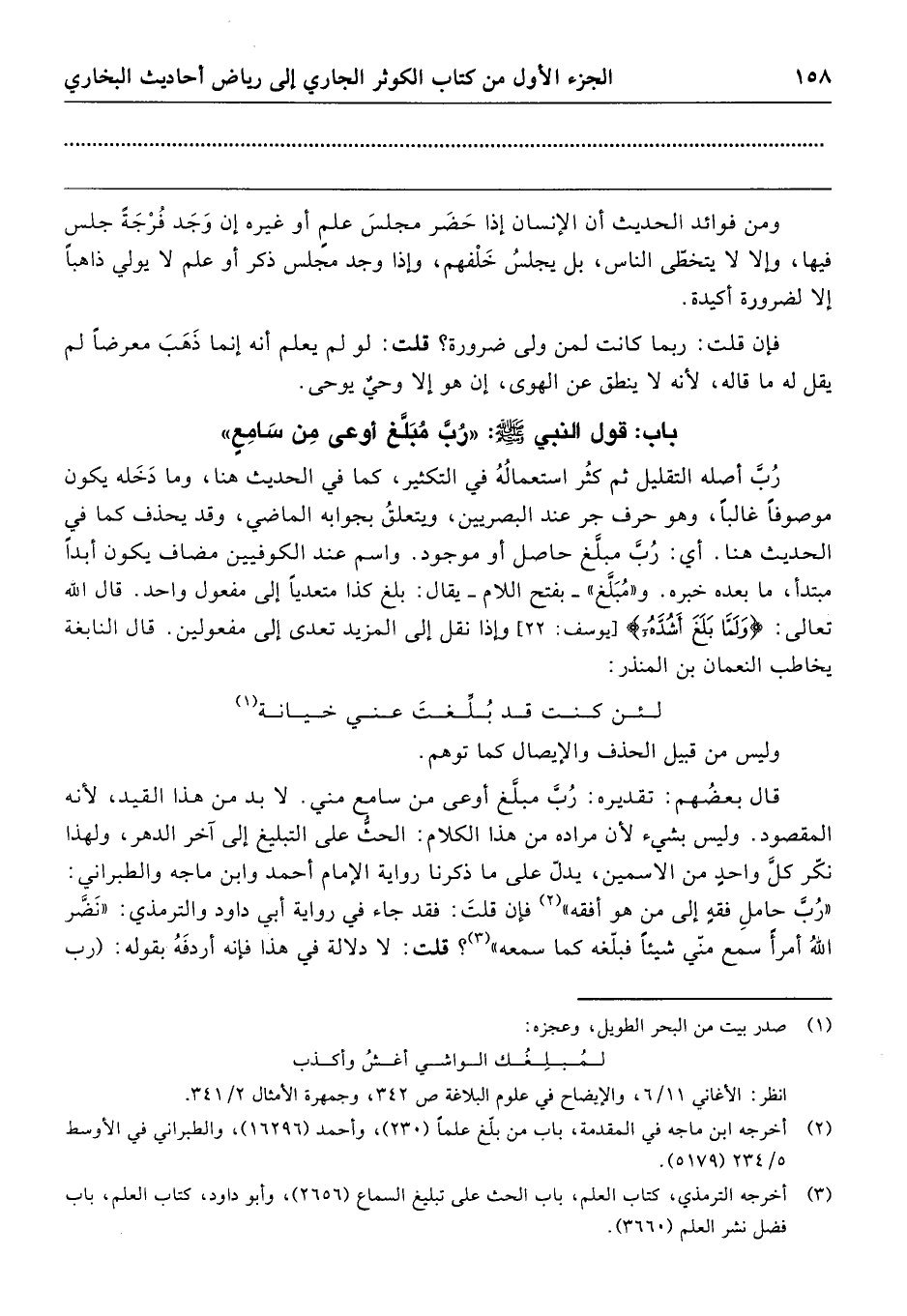 قال بعضُهم: تقديره: رُبَّ مبلَّغ أوعى من سامع مني. لا بد من هذا القيد، لأنه المقصود. وليس بشيء لأن مراده من هذا الكلام: الحث على التبليغ إلى آخر الدهر، ولهذا نكّر كلَّ واحدٍ من الاسمين، يدلّ على ما ذكرنا رواية الإمام أحمد وابن ماجه والطبراني: "رُب حاملِ فقهٍ إلى من هو أفقه" فإن قلتَ: فقد جاء في رواية أبي داود والترمذي: "نَضَّر اللهُ أمرأَ سمع منّي شيئًا فبلّغه كما سمعه"؟ قلت: لا دلالة في هذا فإنه أردفَهُ بقوله: (رب