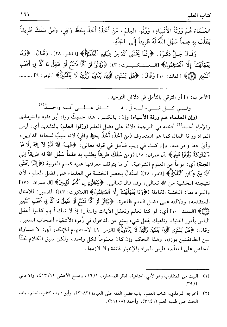 العُلَمَاءَ هُمْ وَرَثَةُ الأَنْبِيَاءِ، وَرَّثُوا العِلْمَ، مَنْ أَخَذَهُ أَخَذَ بِحَظٍّ وَافِرٍ، وَمَنْ سَلَكَ طَرِيقًا يَطْلُبُ بِهِ عِلْمًا سَهَّلَ اللَّهُ لَهُ طَرِيقًا إِلَى الجَنَّةِ» وَقَالَ جَلَّ ذِكْرُهُ: {إِنَّمَا يَخْشَى اللَّهَ مِنْ عِبَادِهِ العُلَمَاءُ} [فاطر: 28] وَقَالَ: {وَمَا يَعْقِلُهَا إِلَّا العَالِمُونَ} [العنكبوت: 43] {وَقَالُوا لَوْ كُنَّا نَسْمَعُ أَوْ نَعْقِلُ مَا كُنَّا فِي أَصْحَابِ السَّعِيرِ} [الملك: 10] وَقَالَ: {هَلْ يَسْتَوِي الَّذِينَ يَعْلَمُونَ وَالَّذِينَ لاَ يَعْلَمُونَ} [الزمر: 9]
