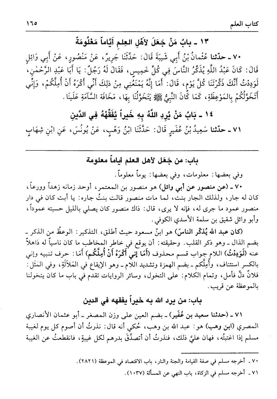 71 - (حدثنا سعيد بن عُفَير) -بضم العين على وزن المصغر- أبو عثمان الأنصاري المصري (ابن وهب) هو: عبد الله بن وهب، حُكي أنه قال: نذرتُ أن أصوم كل يوم لغيبة مسلم إذا اغتبتُه، فهان عليَّ ذلك، فنذرتُ أن أتصدَّقَ بدرهم لكل غيبةٍ، فانقطعتُ عن الغيبة