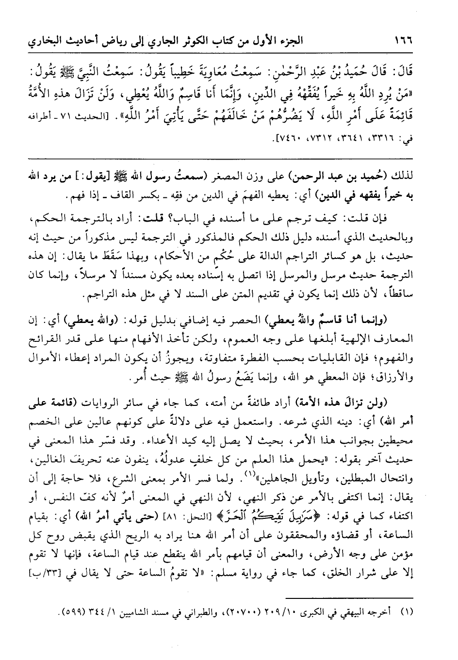قَالَ: قَالَ حُمَيْدُ بْنُ عَبْدِ الرَّحْمَنِ، سَمِعْتُ مُعَاوِيَةَ، خَطِيبًا يَقُولُ سَمِعْتُ النَّبِيَّ صَلَّى اللهُ عَلَيْهِ وَسَلَّمَ يَقُولُ: «مَنْ يُرِدِ اللَّهُ بِهِ خَيْرًا يُفَقِّهْهُ فِي الدِّينِ، وَإِنَّمَا أَنَا قَاسِمٌ وَاللَّهُ يُعْطِي، وَلَنْ تَزَالَ هَذِهِ الأُمَّةُ قَائِمَةً عَلَى أَمْرِ اللَّهِ، لاَ يَضُرُّهُمْ مَنْ خَالَفَهُمْ، حَتَّى يَأْتِيَ أَمْرُ اللَّهِ». [الحديث 71 - أطرافه في: 3316 - 3641 - 7312 - 7460]