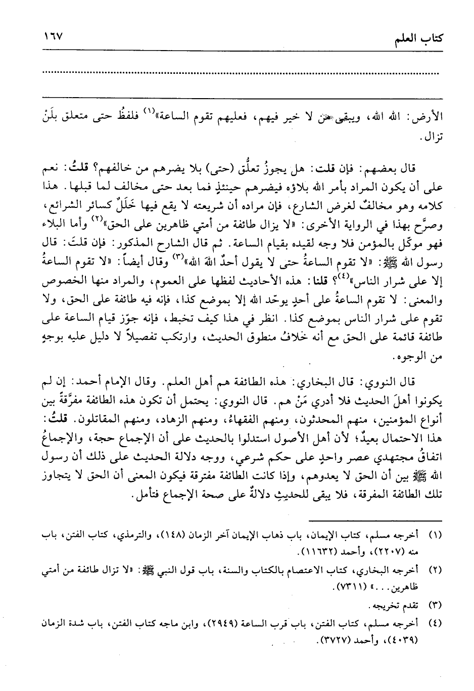قال النووي: قال البخاري: هذه الطائفة هم أهل العلم. وقال الإمام أحمد: إن لم يكونوا أهلَ الحديث فلا أدري مَنْ هم. قال النووي: يحتمل أن تكون هذه الطائفة مفرَّقة بين أنواع المؤمنين، منهم المحدثون، ومنهم الفقهاءُ، ومنهم الزهاد، ومنهم المقاتلون. قلت: هذا الاحتمال بعيدٌ؟ لأن أهل الأصول استدلوا بالحديث على أن الإجماع حجة، والإجماعُ اتفاقُ مجتهدي عصر واحدٍ على حكم شرعي، ووجه دلالة الحديث على ذلك أن رسول الله -صلى الله عليه وسلم- بين أن الحق لا يعدوهم، وإذا كانت الطائفة مفترقة فيكون المعنى أن الحق لا يتجاوز تلك الطائفة المفرقة، فلا يبقى للحديث دلالةٌ على صحة الإجماع فتأمل.
