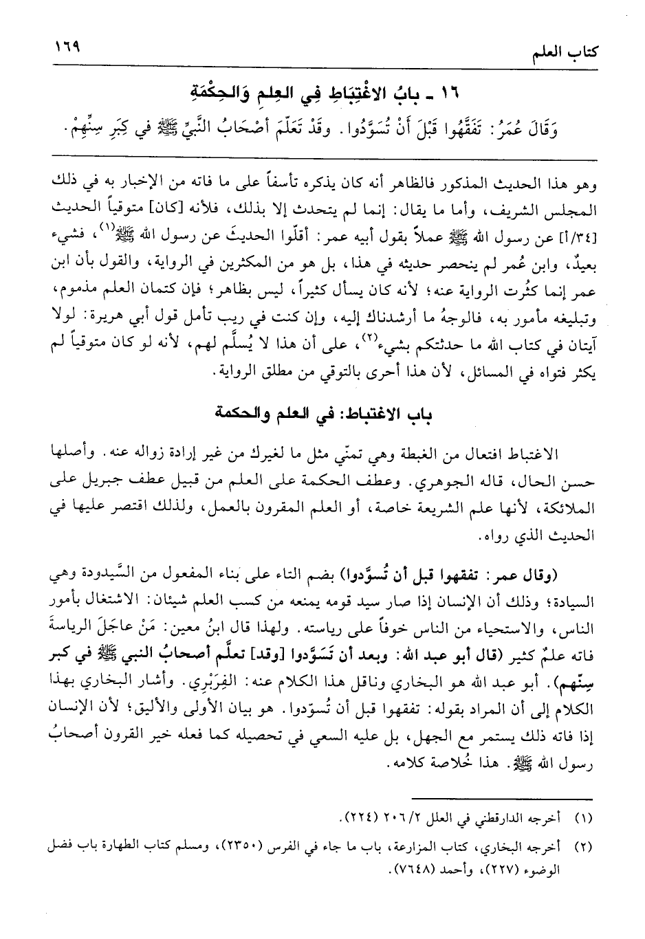 وَقَالَ عُمَرُ: «تَفَقَّهُوا قَبْلَ أَنْ تُسَوَّدُوا». وَقَدْ تَعَلَّمَ أَصْحَابُ النَّبِيِّ صَلَّى اللهُ عَلَيْهِ وَسَلَّمَ فِي كِبَرِ سِنِّهِمْ».