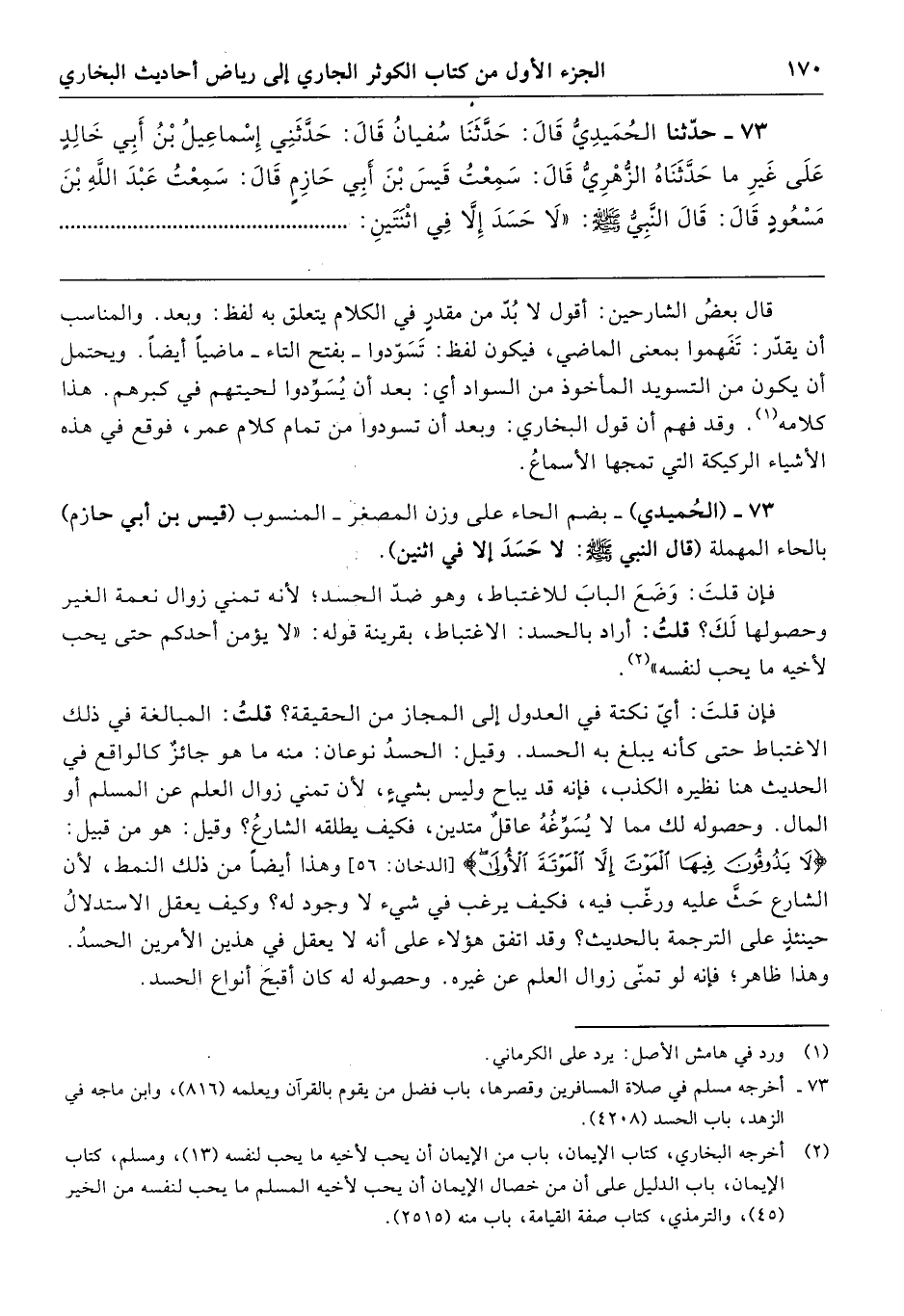 73 - (الحُميدي) -بضم الحاء على وزن المصغر- المنسوب (قيس بن أبي حازم) بالحاء المهملة (قال النبي -صلى الله عليه وسلم-: لا حَسَدَ إلا في اثنين).