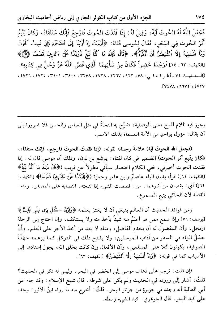فَجَعَلَ اللَّهُ لَهُ الحُوتَ آيَةً، وَقِيلَ لَهُ: إِذَا فَقَدْتَ الحُوتَ فَارْجِعْ، فَإِنَّكَ سَتَلْقَاهُ، وَكَانَ يَتَّبِعُ أَثَرَ الحُوتِ فِي البَحْرِ، فَقَالَ لِمُوسَى فَتَاهُ: (أَرَأَيْتَ إِذْ أَوَيْنَا إِلَى الصَّخْرَةِ فَإِنِّي نَسِيتُ الحُوتَ وَمَا أَنْسَانِيهِ إِلَّا الشَّيْطَانُ أَنْ أَذْكُرَهُ)، قَالَ: (ذَلِكَ مَا كُنَّا نَبْغِي فَارْتَدَّا عَلَى آثَارِهِمَا قَصَصًا)، فَوَجَدَا خَضِرًا، فَكَانَ مِنْ شَأْنِهِمَا الَّذِي قَصَّ اللَّهُ عَزَّ وَجَلَّ فِي كِتَابِهِ". [الحديث 74 - أطرافه في: 78 - 122 - 2267 - 3278 - 3400 - 3401 - 4725 - 4726 - 4727 - 6672 - 7478].