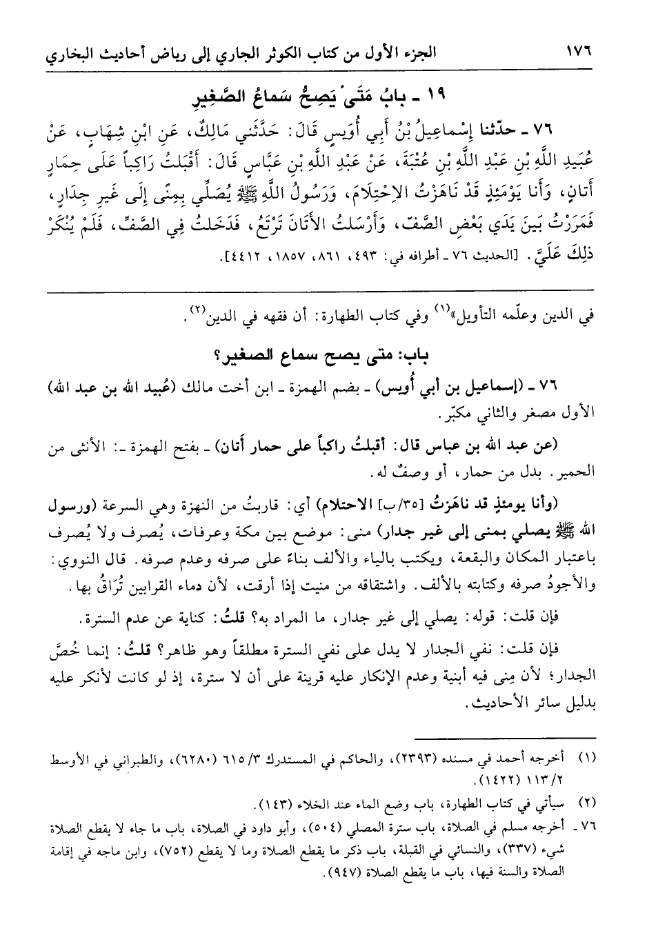 76 - حَدَّثَنَا إِسْمَاعِيلُ بْنُ أَبِي أُوَيْسٍ، قَالَ: حَدَّثَنِي مَالِكٌ، عَنِ ابْنِ شِهَابٍ، عَنْ عُبَيْدِ اللَّهِ بْنِ عَبْدِ اللَّهِ بْنِ عُتْبَةَ، عَنْ عَبْدِ اللَّهِ بْنِ عَبَّاسٍ، قَالَ: «أَقْبَلْتُ رَاكِبًا عَلَى حِمَارٍ أَتَانٍ، وَأَنَا يَوْمَئِذٍ قَدْ نَاهَزْتُ الِاحْتِلاَمَ، وَرَسُولُ اللَّهِ صَلَّى اللهُ عَلَيْهِ وَسَلَّمَ يُصَلِّي بِمِنًى إِلَى غَيْرِ جِدَارٍ، فَمَرَرْتُ بَيْنَ يَدَيْ بَعْضِ الصَّفِّ، وَأَرْسَلْتُ الأَتَانَ تَرْتَعُ، فَدَخَلْتُ فِي الصَّفِّ، فَلَمْ يُنْكَرْ ذَلِكَ عَلَيَّ». [الحديث 76 - أطرافه في: 493 - 861 - 1857 - 4412].