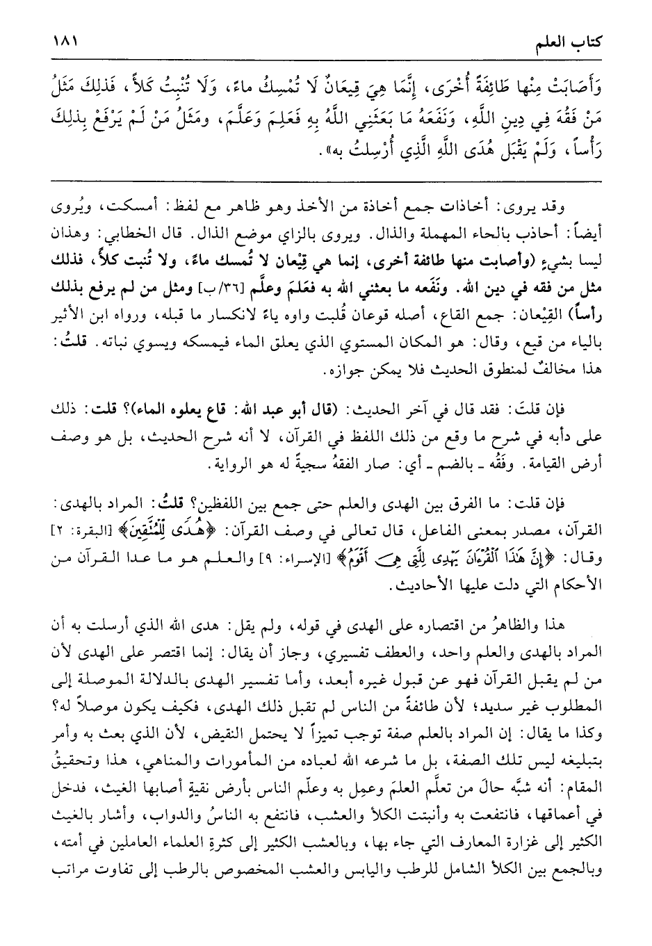 وقد يروى: أخاذات جمع أخاذة من الأخذ وهو ظاهر مع لفظ: أمسكت، ويُروى أيضًا: أحاذب بالحاء المهملة والذال. ويروى بالزاي موضع الذال. قال الخطابي: وهذان ليسا بشيءٍ (وأصابت منها طائفة أخرى، إنما هي قِيْعان لا تُمسك ماءً، ولا تُنبت كلأً، فذلك مثل من فقه في دين الله. ونَفَعه ما بعثني الله به فعَلمَ وعلَّم ومثل من لم يرفع بذلك رأسًا) القِيْعان: جمع القاع، أصله قوعان قُلبت واوه ياءً لانكسار ما قبله، ورواه ابن الأثير بالياء من قيع، وقال: هو المكان المستوي الذي يعلق الماء فيمسكه ويسوي نباته. قلتُ: هذا مخالفٌ لمنطوق الحديث فلا يمكن جوازه.