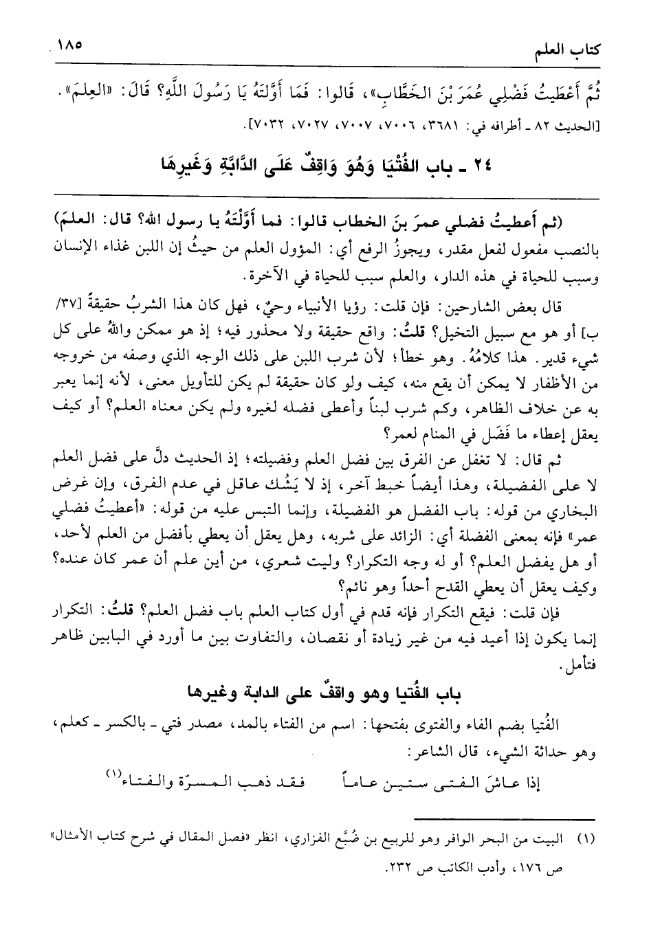 ثم قال: لا تغفل عن الفرق بين فضل العلم وفضيلته؛ إذ الحديث دلَّ على فضل العلم لا على الفضيلة، وهذا أيضًا خبط آخر، إذ لا يَشُك عاقل في عدم الفرق، وإن غرض البخاري من قوله: باب الفضل هو الفضيلة، وإنما التبس عليه من قوله: "أعطيتُ فضلي عمر" فإنه بمعنى الفضلة أي: الزائد على شربه، وهل يعقل أن يعطي بأفضل من العلم لأحد، أو هل يفضل العلم؟ أو له وجه التكرار؟ وليت شعري، من أين علم أن عمر كان عنده؟ وكيف يعقل أن يعطي القدح أحدًا وهو نائم؟