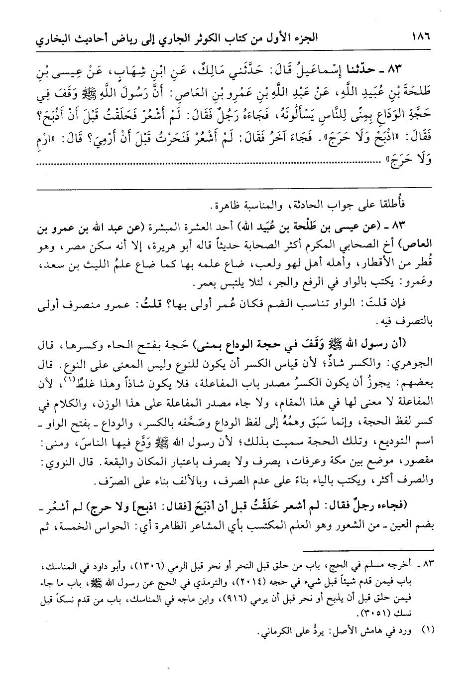83 - (عن عيسى بن طَلْحة بن عُبَيد الله) أحد العشرة المبشرة (عن عبد الله بن عمرو بن العاص) أخ الصحابي المكرم أكثر الصحابة حديثًا قاله أبو هريرة، إلا أنه سكن مصر، وهو قُطر من الأقطار، وأهله أهل لهو ولعب، ضاع علمه بها كما ضاع علمُ الليث بن سعد، وعَمرو: يكتب بالواو في الرفع والجر، لئلا يلتبس بعمر.