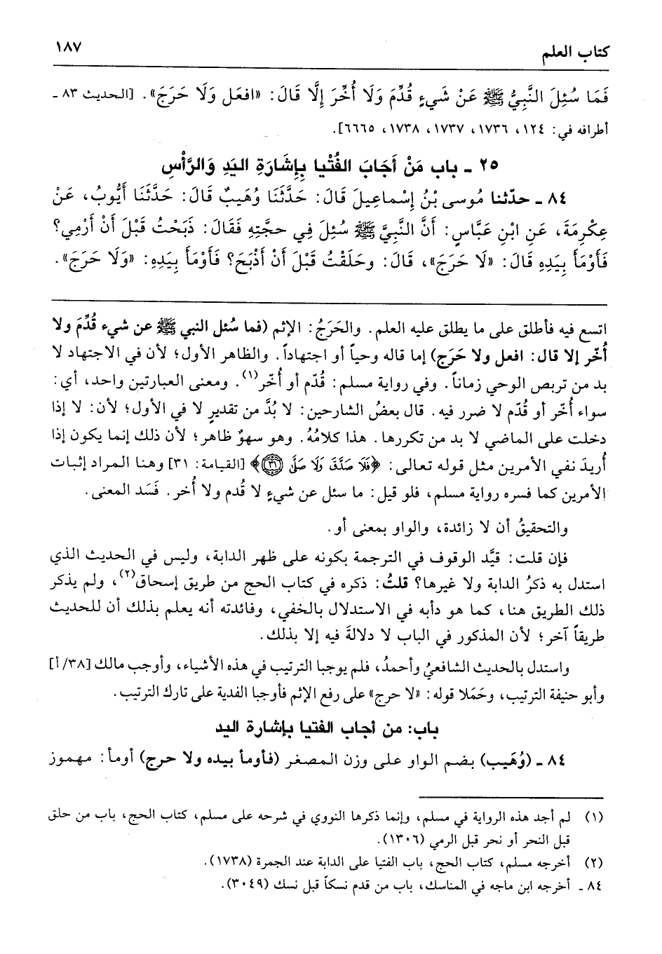84 - حَدَّثَنَا مُوسَى بْنُ إِسْمَاعِيلَ، قَالَ: حَدَّثَنَا وُهَيْبٌ، قَالَ: حَدَّثَنَا أَيُّوبُ، عَنْ عِكْرِمَةَ، عَنِ ابْنِ عَبَّاسٍ أَنَّ النَّبِيَّ صَلَّى اللهُ عَلَيْهِ وَسَلَّمَ سُئِلَ فِي حَجَّتِهِ فَقَالَ: ذَبَحْتُ قَبْلَ أَنْ أَرْمِيَ؟ فَأَوْمَأَ بِيَدِهِ، قَالَ: «وَلاَ حَرَجَ» قَالَ: حَلَقْتُ قَبْلَ أَنْ أَذْبَحَ؟ فَأَوْمَأَ بِيَدِهِ: «وَلاَ حَرَجَ».