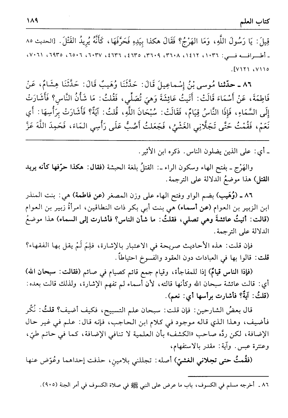 86 - (وُهَيب) بضم الواو وفتح الهاء على وزن المصغر (عن فاطمة) هي: بنت المنذر بن الزبير بن العوام (عن أسماء) هي بنت أبي بكر ذات النطاقين، امرأةُ زبير بن العوام (قالت: أتيتُ عائشةَ وهي تصلي، فقلتُ: ما شأن الناس؟ فأشارت إلى السماء) هذا موضعُ الدلالة على الترجمة.