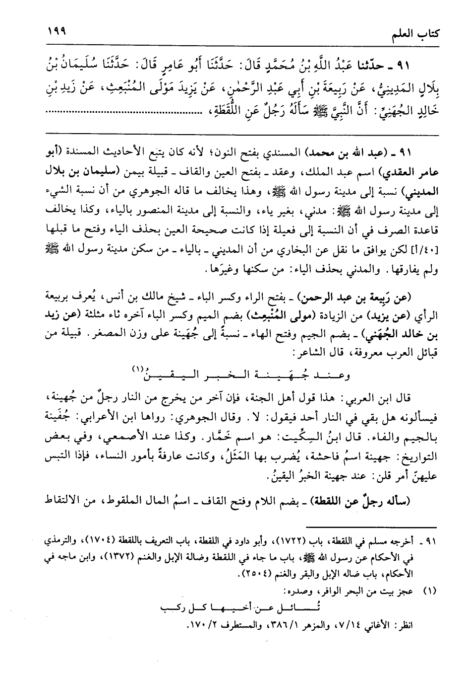 91 - حَدَّثَنَا عَبْدُ اللَّهِ بْنُ مُحَمَّدٍ، قَالَ: حَدَّثَنَا عَبْدُ المَلِكِ بْنُ عَمْرٍو العَقَدِيُّ، قَالَ: حَدَّثَنَا سُلَيْمَانُ بْنُ بِلاَلٍ المَدِينِيُّ، عَنْ رَبِيعَةَ بْنِ أَبِي عَبْدِ الرَّحْمَنِ، عَنْ يَزِيدَ مَوْلَى المُنْبَعِثِ عَنْ زَيْدِ بْنِ خَالِدٍ الجُهَنِيِّ أَنَّ النَّبِيَّ صَلَّى اللهُ عَلَيْهِ وَسَلَّمَ سَأَلَهُ رَجُلٌ عَنِ اللُّقَطَةِ،
