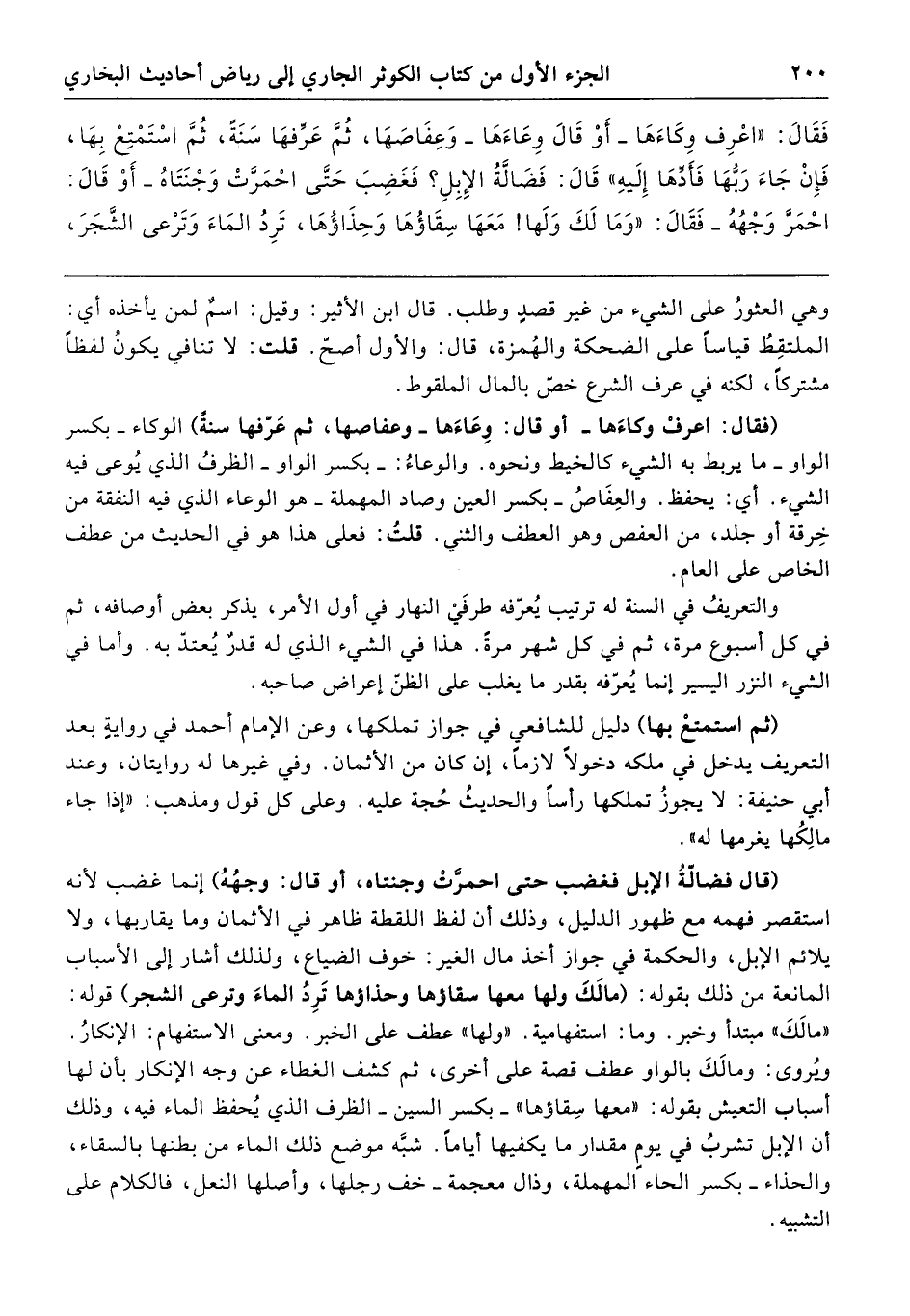 (قال فضالّةُ الإبل فغضب حتى احمرَّتْ وجنتاه، أو قال: وجهُهُ) إنما غضب لأنه استقصر فهمه مع ظهور الدليل، وذلك أن لفظ اللقطة ظاهر في الأثمان وما يقاربها، ولا يلائم الإبل، والحكمة في جواز أخذ مال الغير: خوف الضياع، ولذلك أشار إلى الأسباب المانعة من ذلك بقوله: (ما لَكَ ولها معها سقاؤها وحذاؤها تَرِدُ الماءَ وترعى الشجر) قوله: "ما لَكَ" مبتدأ وخبر. وما: استفهامية. "ولها" عطف على الخبر. ومعنى الاستفهام: الإنكارُ. ويُروى: وما لَكَ بالواو عطف قصة على أخرى، ثم كشف الغطاء عن وجه الإنكار بأن لها أسباب التعيش بقوله: "معها سِقاؤها" -بكسر السين- الظرف الذي يُحفظ الماء فيه، وذلك أن الإبل تشربُ في يومٍ مقدار ما يكفيها أيامًا. شبَّه موضع ذلك الماء من بطنها بالسقاء، والحذاء -بكسر الحاء المهملة، وذال معجمة- خف رجلها، وأصلها النعل، فالكلام على التشبيه.