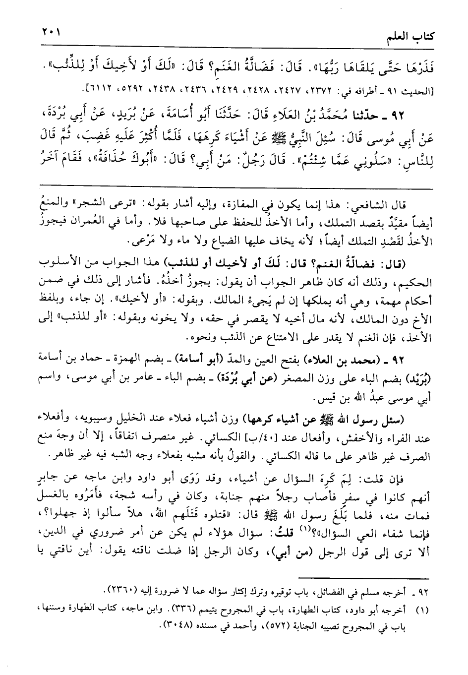 92 - (محمد بن العلاء) بفتح العين والمدّ (أبو أسامة) -بضم الهمزة - حماد بن أسامة (بُرَيْد) بضم الباء على وزن المصغر (عن أبي بُرْدَة) -بضم الباء - عامر بن أبي موسى، واسم أبي موسى عبدُ الله بن قيس.