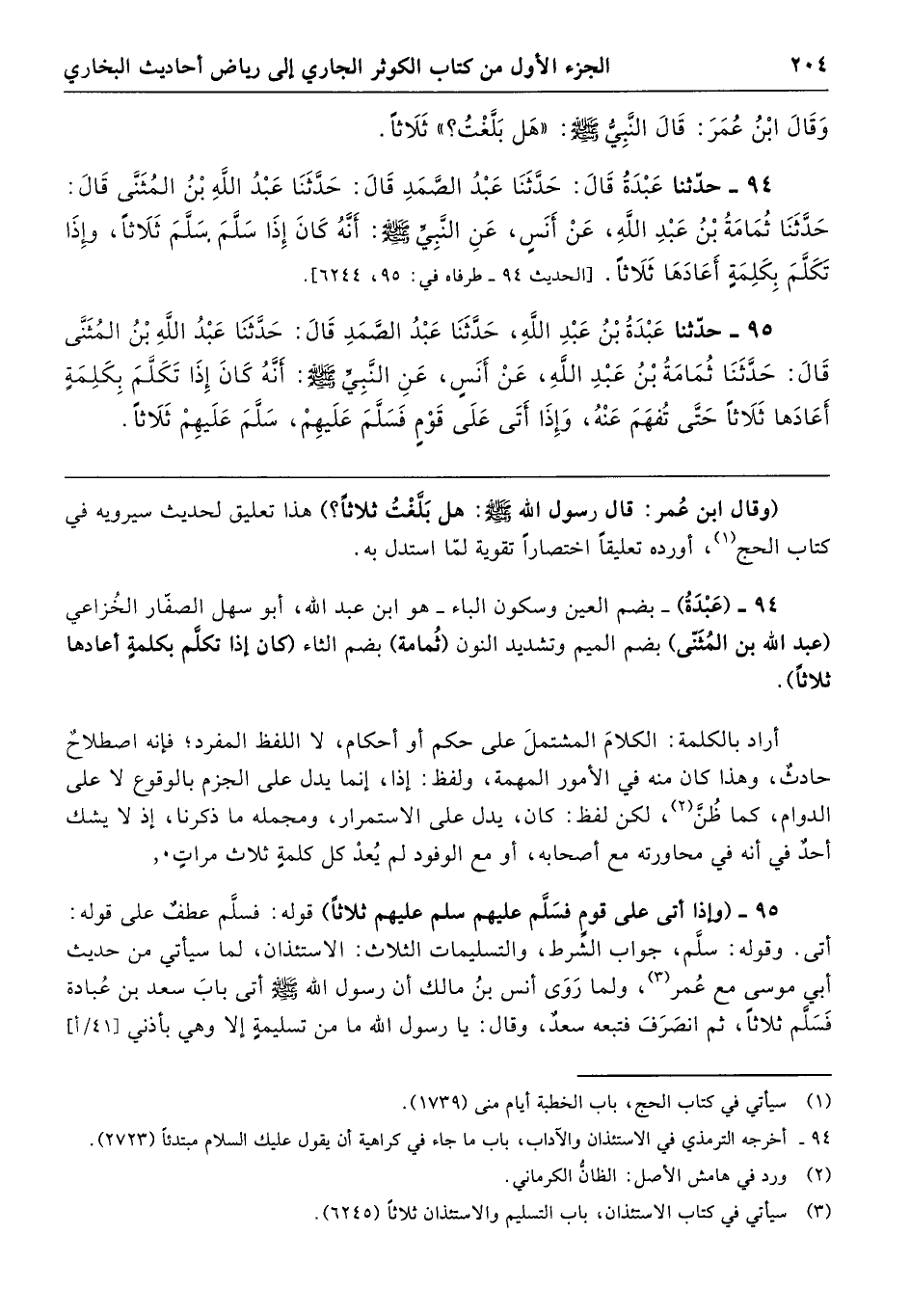 94 - (عَبْدَةُ) -بضم العين وسكون الباء- هو ابن عبد الله، أبو سهل الصفَّار الخُزاعي (عبد الله بن المُثَنَّى) بضم الميم وتشديد النون (ثُمامة) بضم الثاء كان إذا تكلَّم بكلمةٍ أعادها ثلاثًا).