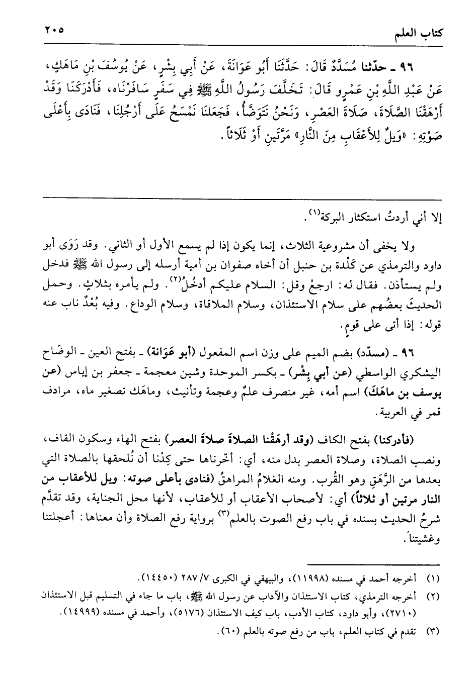 96 - حَدَّثَنَا مُسَدَّدٌ، قَالَ: حَدَّثَنَا أَبُو عَوَانَةَ، عَنْ أَبِي بِشْرٍ، عَنْ يُوسُفَ بْنِ مَاهَكَ، عَنْ عَبْدِ اللَّهِ بْنِ عَمْرٍو قَالَ: تَخَلَّفَ رَسُولُ اللَّهِ صَلَّى اللهُ عَلَيْهِ وَسَلَّمَ فِي سَفَرٍ سَافَرْنَاهُ، فَأَدْرَكَنَا وَقَدْ أَرْهَقْنَا الصَّلاَةَ، صَلاَةَ العَصْرِ، وَنَحْنُ نَتَوَضَّأُ، فَجَعَلْنَا نَمْسَحُ عَلَى أَرْجُلِنَا فَنَادَى بِأَعْلَى صَوْتِهِ «وَيْلٌ لِلْأَعْقَابِ مِنَ النَّارِ مَرَّتَيْنِ أَوْ ثَلاَثًا».