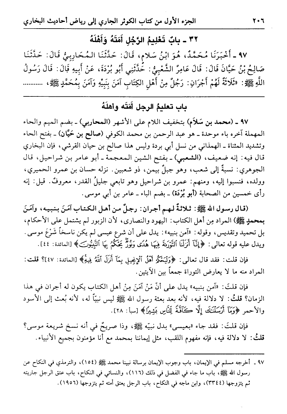 (قال رسول الله - صلى الله عليه وسلم -: ثلاثةٌ لهم أجران: رجلٌ من أهل الكتاب آمَنَ بنبيه، وآمَنَ بمحمدٍ - صلى الله عليه وسلم -) المراد مِن أهل الكتاب: اليهود والنصارى، لأن الزبور لم يشتمل على الأحكام، بل تحميد وتقديس، وقوله: "آمن بنبيه": يدل على أن شرع عيسى لم يكن ناسخًا شَرْعَ موسى، ويدل عليه قوله تعالى: {إِنَّا أَنْزَلْنَا التَّوْرَاةَ فِيهَا هُدًى وَنُورٌ يَحْكُمُ بِهَا النَّبِيُّونَ} [المائدة: 44].