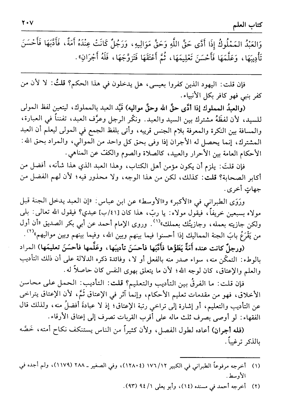 فإن قلتَ: يلزم أن يكون مؤمن أهل الكتاب، وهذا العبد الَّذي هذا شأنه، أفضل من أكابر الصحابة؟ قلت: كذلك، لكن من هذا الوجه، ولا محذور فيه؛ لأن لهم الفضل من جهاتٍ أخرى.