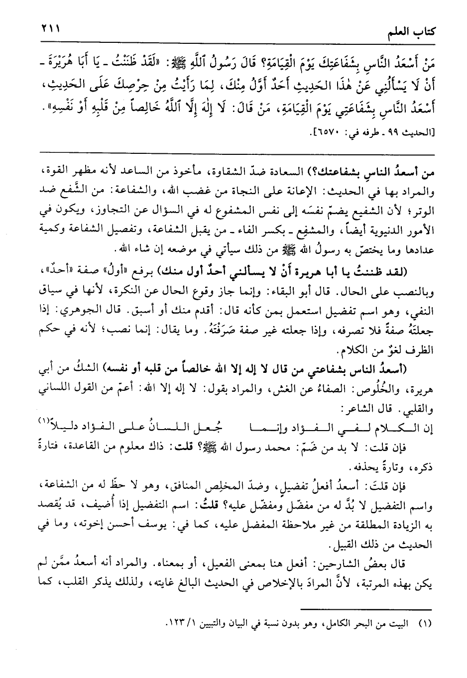 مَنْ أَسْعَدُ النَّاسِ بِشَفَاعَتِكَ يَوْمَ القِيَامَةِ؟ قَالَ رَسُولُ اللَّهِ صَلَّى اللهُ عَلَيْهِ وَسَلَّمَ: «لَقَدْ ظَنَنْتُ يَا أَبَا هُرَيْرَةَ أَنْ لاَ يَسْأَلُنِي عَنْ هَذَا الحَدِيثِ أَحَدٌ أَوَّلُ مِنْكَ لِمَا رَأَيْتُ مِنْ حِرْصِكَ عَلَى الحَدِيثِ أَسْعَدُ النَّاسِ بِشَفَاعَتِي يَوْمَ القِيَامَةِ، مَنْ قَالَ لاَ إِلَهَ إِلَّا اللَّهُ، خَالِصًا مِنْ قَلْبِهِ، أَوْ نَفْسِهِ» [الحديث 99 - طرفه في: 6570].