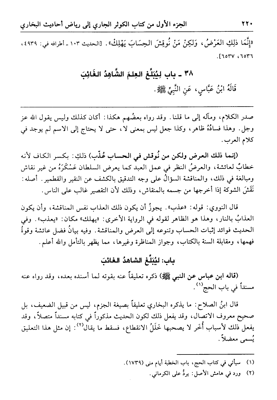 (إنما ذلك العرض ولكن من نُوقش في الحساب عُذّب) ذلكِ: بكسر الكاف لأنه خطابٌ لعائشة، والعرضُ النظر في عمل العبد كما يعرض السلطان عَسْكَرَهُ من غير نقاش ومبالغة في ذلك، والمناقشة السؤالُ على وجه التدقيق بالكشف عن النقير والقطمير. أصله: نَقَشَ الشوكة إذا أخرجها من جسمه بالمنقاش، وذلك لأن التقصير غالب على الناس.