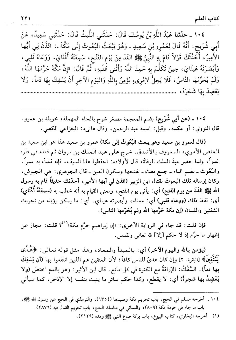 104 - حَدَّثَنَا عَبْدُ اللَّهِ بْنُ يُوسُفَ، قَالَ: حَدَّثَنِي اللَّيْثُ، قَالَ: حَدَّثَنِي سَعِيدٌ هُوَ ابْنُ أَبِي سَعِيدٍ، عَنْ أَبِي شُرَيْحٍ، أَنَّهُ قَالَ لِعَمْرِو بْنِ سَعِيدٍ: - وَهُوَ يَبْعَثُ البُعُوثَ إِلَى مَكَّةَ - ائْذَنْ لِي أَيُّهَا الأَمِيرُ، أُحَدِّثْكَ قَوْلًا قَامَ بِهِ النَّبِيُّ صَلَّى اللهُ عَلَيْهِ وَسَلَّمَ الغَدَ مِنْ يَوْمِ الفَتْحِ، سَمِعَتْهُ أُذُنَايَ وَوَعَاهُ قَلْبِي، وَأَبْصَرَتْهُ عَيْنَايَ حِينَ تَكَلَّمَ بِهِ: حَمِدَ اللَّهَ وَأَثْنَى عَلَيْهِ، ثُمَّ قَالَ: " إِنَّ مَكَّةَ حَرَّمَهَا اللَّهُ، وَلَمْ يُحَرِّمْهَا النَّاسُ، فَلاَ يَحِلُّ لِامْرِئٍ يُؤْمِنُ بِاللَّهِ وَاليَوْمِ الآخِرِ أَنْ يَسْفِكَ بِهَا دَمًا، وَلاَ يَعْضِدَ بِهَا شَجَرَةً،
