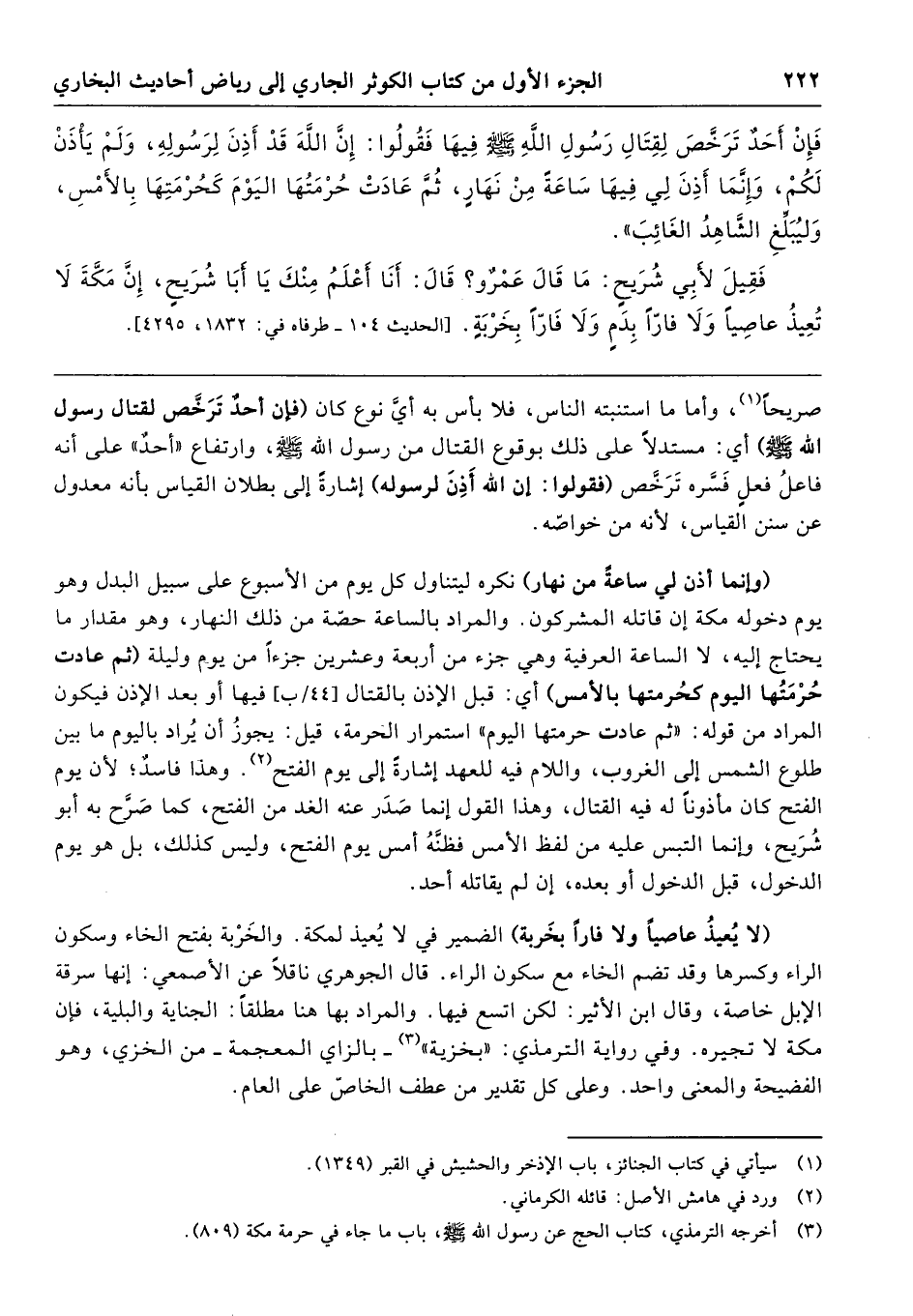 فَإِنْ أَحَدٌ تَرَخَّصَ لِقِتَالِ رَسُولِ اللَّهِ صَلَّى اللهُ عَلَيْهِ وَسَلَّمَ فِيهَا، فَقُولُوا: إِنَّ اللَّهَ قَدْ أَذِنَ لِرَسُولِهِ وَلَمْ يَأْذَنْ لَكُمْ، وَإِنَّمَا أَذِنَ لِي فِيهَا سَاعَةً مِنْ نَهَارٍ، ثُمَّ عَادَتْ حُرْمَتُهَا اليَوْمَ كَحُرْمَتِهَا بِالأَمْسِ، وَلْيُبَلِّغِ الشَّاهِدُ الغَائِبَ " فَقِيلَ لِأَبِي شُرَيْحٍ مَا قَالَ عَمْرٌو قَالَ: أَنَا أَعْلَمُ مِنْكَ يَا أَبَا شُرَيْحٍ لاَ يُعِيذُ عَاصِيًا وَلاَ فَارًّا بِدَمٍ وَلاَ فَارًّا بِخَرْبَةٍ [الحديث 104 - طرفاه في: 1832، 4295].