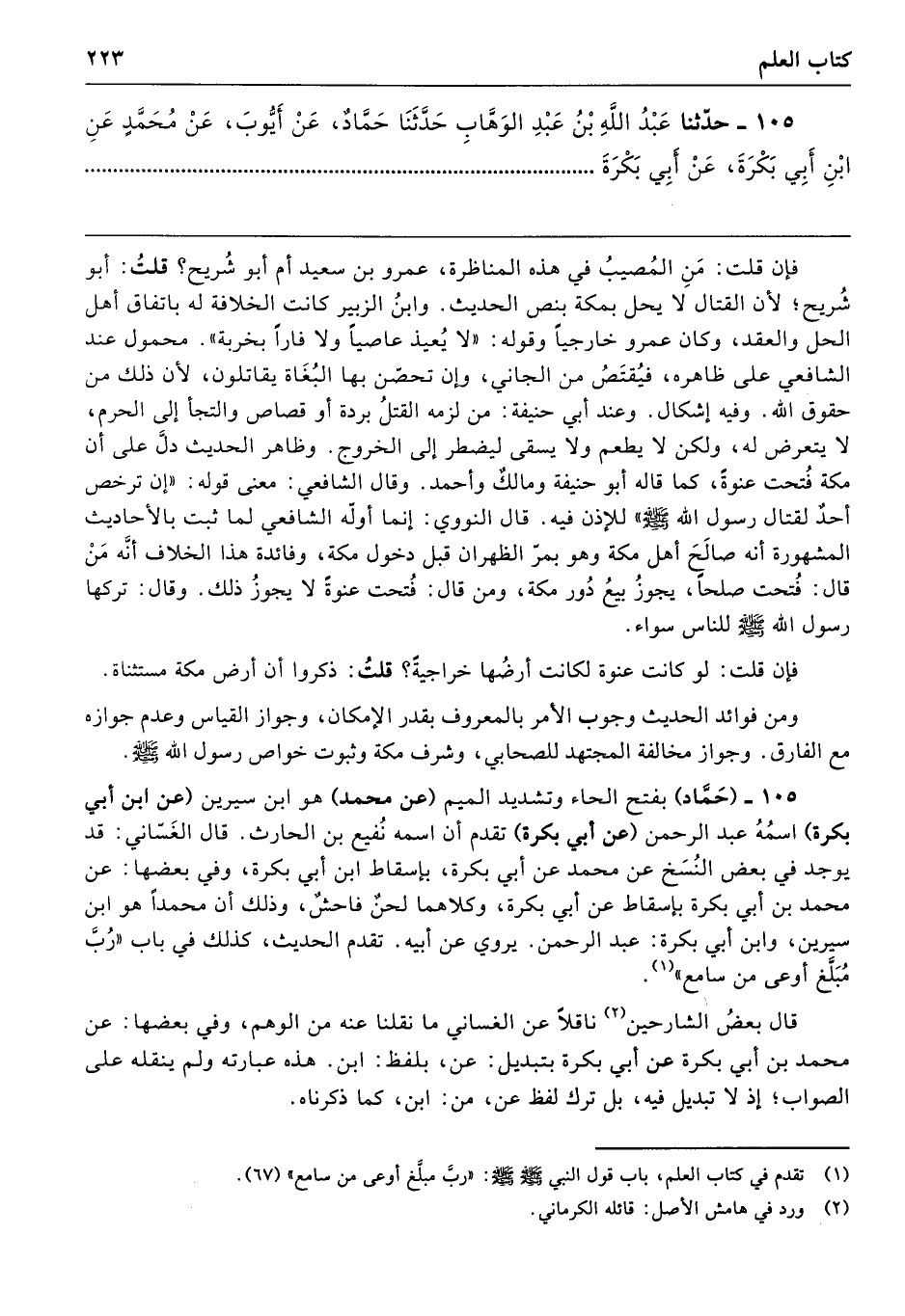 105 - (حَمَّاد) بفتح الحاء وتشديد الميم (عن محمد) هو ابن سيرين (عن ابن أبي بكرة) اسمُهُ عبد الرحمن (عن أبي بكرة) تقدم أن اسمه نُفيع بن الحارث. قال الغَسّاني: قد يوجد في بعض النُسَخ عن محمد عن أبي بكرة، بإسقاط ابن أبي بكرة، وفي بعضها: عن محمد بن أبي بكرة بإسقاط عن أبي بكرة، وكلاهما لحنٌ فاحشٌ، وذلك أن محمدًا هو ابن سيرين، وابن أبي بكرة: عبد الرحمن. يروي عن أبيه. تقدم الحديث، كذلك في باب "رُبَّ مُبَلَّغ أوعى من سامع".