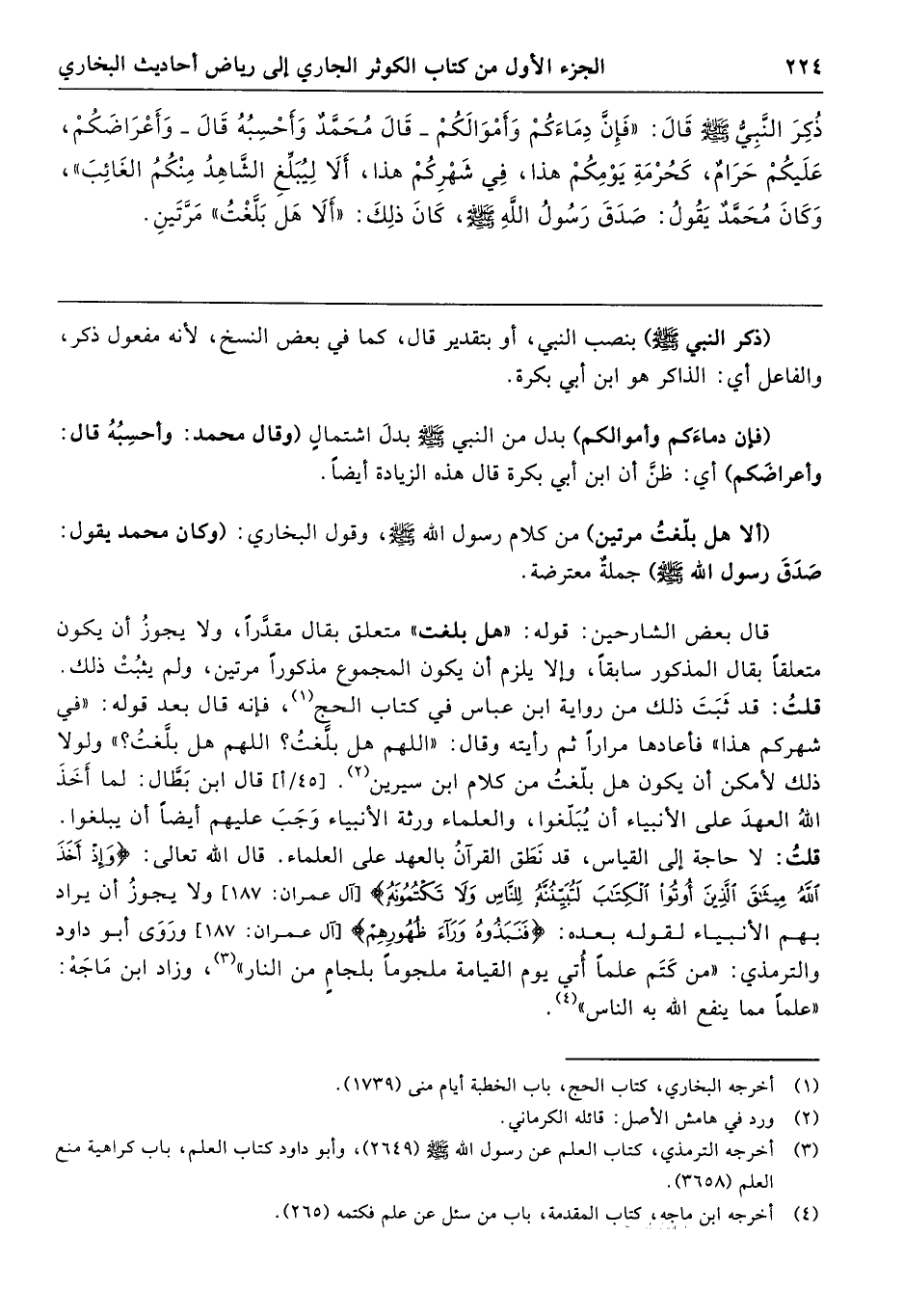 (ألا هل بلّغتُ مرتين) من كلام رسول الله - صلى الله عليه وسلم -، وقول البخاري: (وكان محمد يقول: صَدَقَ رسول الله - صلى الله عليه وسلم -) جملةٌ معترضة.