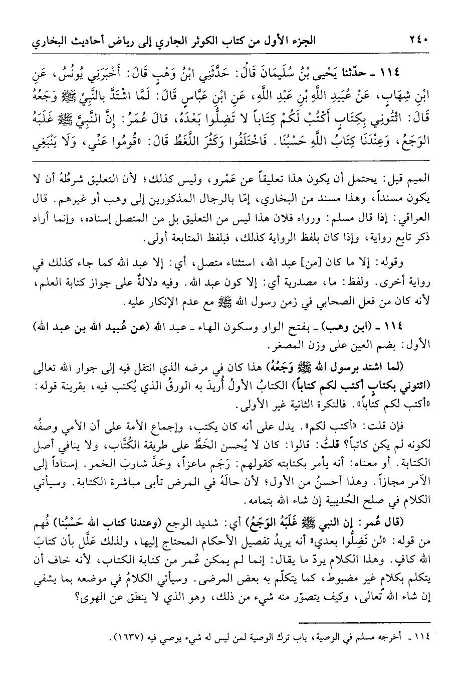 114 - حَدَّثَنَا يَحْيَى بْنُ سُلَيْمَانَ، قَالَ: حَدَّثَنِي ابْنُ وَهْبٍ، قَالَ: أَخْبَرَنِي يُونُسُ، عَنِ ابْنِ شِهَابٍ، عَنْ عُبَيْدِ اللَّهِ بْنِ عَبْدِ اللَّهِ، عَنِ ابْنِ عَبَّاسٍ، قَالَ: لَمَّا اشْتَدَّ بِالنَّبِيِّ صَلَّى اللهُ عَلَيْهِ وَسَلَّمَ وَجَعُهُ قَالَ: «ائْتُونِي بِكِتَابٍ أَكْتُبْ لَكُمْ كِتَابًا لاَ تَضِلُّوا بَعْدَهُ» قَالَ عُمَرُ إِنَّ النَّبِيَّ صَلَّى اللهُ عَلَيْهِ وَسَلَّمَ غَلَبَهُ الوَجَعُ، وَعِنْدَنَا كِتَابُ اللَّهِ حَسْبُنَا. فَاخْتَلَفُوا وَكَثُرَ اللَّغَطُ، قَالَ: «قُومُوا عَنِّي، وَلاَ يَنْبَغِي