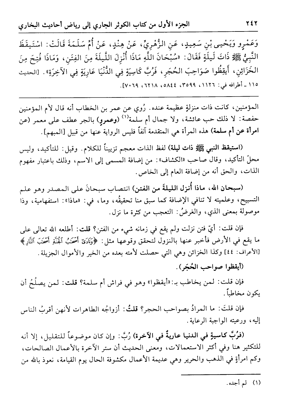 وَعَمْرٍو، وَيَحْيَى بْنِ سَعِيدٍ، عَنِ الزُّهْرِيِّ، عَنْ هِنْدٍ، عَنْ أُمِّ سَلَمَةَ، قَالَتْ: اسْتَيْقَظَ النَّبِيُّ صَلَّى اللهُ عَلَيْهِ وَسَلَّمَ ذَاتَ لَيْلَةٍ فَقَالَ: «سُبْحَانَ اللَّهِ، مَاذَا أُنْزِلَ اللَّيْلَةَ مِنَ الفِتَنِ، وَمَاذَا فُتِحَ مِنَ الخَزَائِنِ، أَيْقِظُوا صَوَاحِبَاتِ الحُجَرِ، فَرُبَّ كَاسِيَةٍ فِي الدُّنْيَا عَارِيَةٍ فِي الآخِرَةِ». [الحديث 115 - أطرافه في: 1126، 3599، 5844، 6218، 7069].
