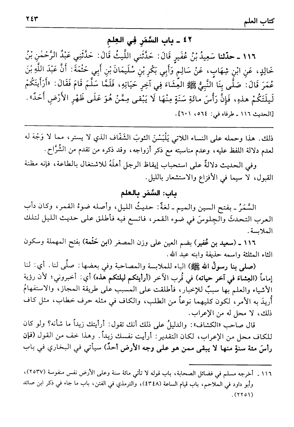116 - حَدَّثَنَا سَعِيدُ بْنُ عُفَيْرٍ، قَالَ: حَدَّثَنِي اللَّيْثُ، قَالَ: حَدَّثَنِي عَبْدُ الرَّحْمَنِ بْنُ خَالِدِ بْنِ مُسَافِرٍ، عَنِ ابْنِ شِهَابٍ، عَنْ سَالِمٍ، وَأَبِي بَكْرِ بْنِ سُلَيْمَانَ بْنِ أَبِي حَثْمَةَ، أَنَّ عَبْدَ اللَّهِ بْنَ عُمَرَ، قَالَ: صَلَّى بِنَا النَّبِيُّ صَلَّى اللهُ عَلَيْهِ وَسَلَّمَ العِشَاءَ فِي آخِرِ حَيَاتِهِ، فَلَمَّا سَلَّمَ قَامَ، فَقَالَ: «أَرَأَيْتَكُمْ لَيْلَتَكُمْ هَذِهِ، فَإِنَّ رَأْسَ مِائَةِ سَنَةٍ مِنْهَا، لاَ يَبْقَى مِمَّنْ هُوَ عَلَى ظَهْرِ الأَرْضِ أَحَدٌ». [الحديث 116 - طرفاه في: 564، 601].