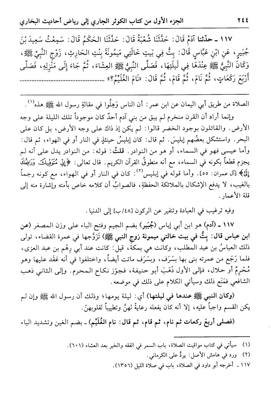 117 - (آدم) هو ابن أبي إياس (جُبَير) بضم الجيم وفتح الباء على وزن المصغر (عن ابن عباس قال: بِتُّ في بيت خالتي ميمونة زوجِ النبي - صلى الله عليه وسلم - تَزَوَّجها في عمرة القضاء، تولى ذلك العباسُ بن عبد المطلب، وكانت هي بمكة، قيل: كانت عند أبي رِهْم بن عبد العزى، فلما رَجَع من عمرته بنى بها بسَرَف، وبسَرَف ماتت أيضًا، واختلفوا في أنَّه عَقَد عليها وهو مُحْرِمٌ أو حلال، فإلى الأول ذَهَبَ أبو حنيفة، فجوّز نكاح المحرم. وإلى الثاني ذهب الشافعي فمَنَع ذلك وسيأتي الكلام على ذلك في موضعه.
