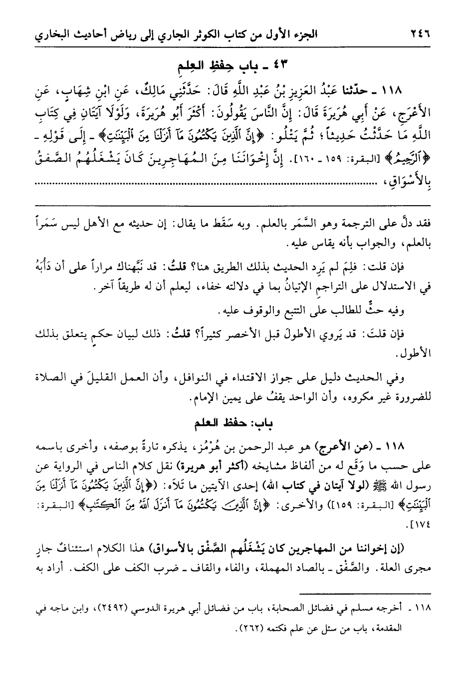 118 - (عن الأعرج) هو عبد الرحمن بن هُرْمُز، يذكره تارةً بوصفه، وأخرى باسمه على حسب ما وَقَع له من ألفاظ مشايخه (أكثر أبو هريرة) نقل كلام الناس في الرواية عن رسول الله - صلى الله عليه وسلم - (لولا آيتان في كتاب الله) إحدى الآيتين ما تَلَاه: {إِنَّ الَّذِينَ يَكْتُمُونَ مَا أَنْزَلْنَا مِنَ الْبِيْنَاتِ} [البقرة: 159] والأخرى: {إِنَّ الَّذِينَ يَكْتُمُونَ مَا أَنْزَلَ اللهُ مِنَ الْكِتَابِ} [البقرة: 174].