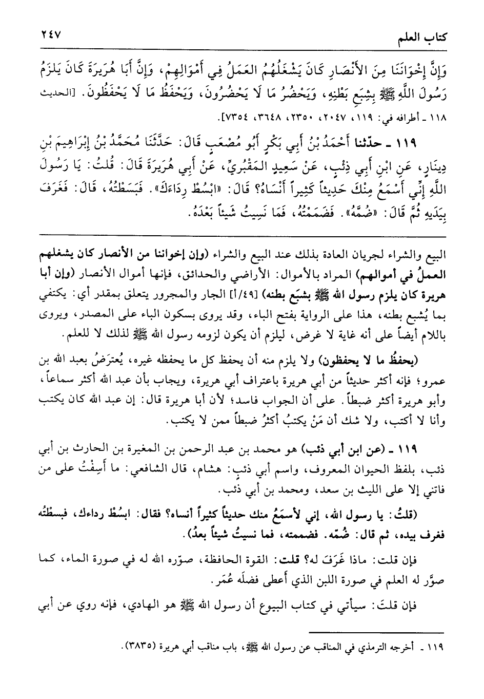 119 - حَدَّثَنَا أَحْمَدُ بْنُ أَبِي بَكْرٍ أَبُو مُصْعَبٍ، قَالَ: حَدَّثَنَا مُحَمَّدُ بْنُ إِبْرَاهِيمَ بْنِ دِينَارٍ، عَنِ ابْنِ أَبِي ذِئْبٍ، عَنْ سَعِيدٍ المَقْبُرِيِّ، عَنْ أَبِي هُرَيْرَةَ، قَالَ: قُلْتُ: يَا رَسُولَ اللَّهِ، إِنِّي أَسْمَعُ مِنْكَ حَدِيثًا كَثِيرًا أَنْسَاهُ؟ قَالَ: «ابْسُطْ رِدَاءَكَ» فَبَسَطْتُهُ، قَالَ: فَغَرَفَ بِيَدَيْهِ، ثُمَّ قَالَ: «ضُمَّهُ» فَضَمَمْتُهُ، فَمَا نَسِيتُ شَيْئًا بَعْدَهُ.