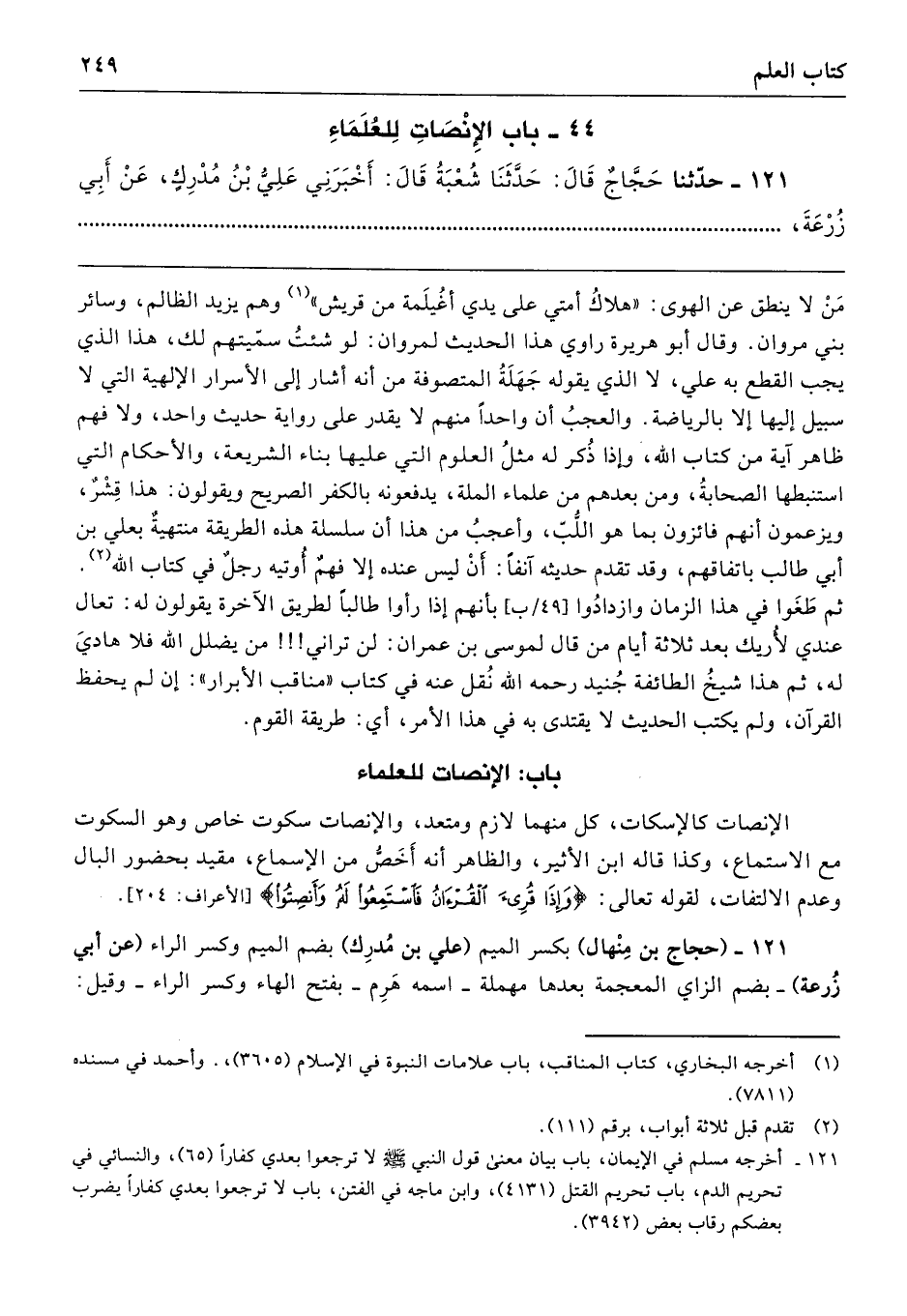 121 - (حجاج بن مِنْهال) بكسر الميم (علي بن مُدرِك) بضم الميم وكسر الراء (عن أبي زُرعة) -بضم الزاي المعجمة بعدها مهملة- اسمه هَرِم -بفتح الهاء وكسر الراء- وقيل: