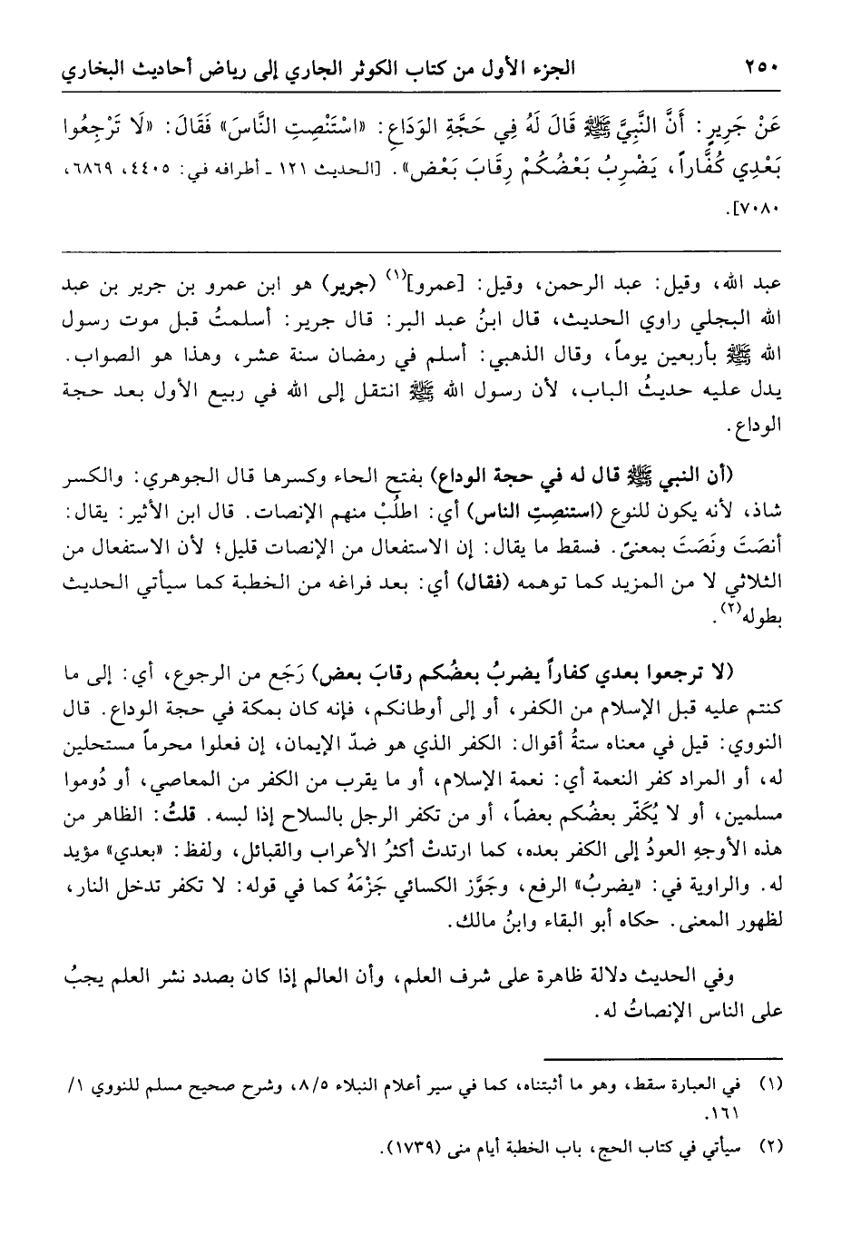 بْنِ عَمْرٍو، عَنْ جَرِيرٍ أَنَّ النَّبِيَّ صَلَّى اللهُ عَلَيْهِ وَسَلَّمَ قَالَ لَهُ فِي حَجَّةِ الوَدَاعِ: «اسْتَنْصِتِ النَّاسَ» فَقَالَ: «لاَ تَرْجِعُوا بَعْدِي كُفَّارًا، يَضْرِبُ بَعْضُكُمْ رِقَابَ بَعْضٍ» [الحديث 121 - أطرافه في: 4405، 6869، 7080].