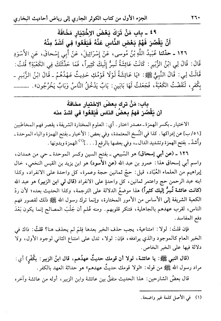 126 - (عن أبي إسحاق) هو السبيعي -بفتح السين وكسر الموحدة- حي من همدان، واسم أبي إسحاق هذا: عمرو بن عبد الله (عن الأسود) هو ابن يزيد بن القيس النخعي، خال إبراهيم من العلماء العُباد، قيل: حج ثمانين حجة وعمرة، كل واحدة على الانفراد، وكذا ابنه عبد الرحمن حج واعتمر ثمانين، كل واحدةٍ على الانفراد (قال لي ابن الزبير) هو عبد الله (كانت عائشة تُسِرُّ إليك كثيرًا) هذا موضعُ الدلالة على الترجمة، وكذا الحديث بعده؛ لأن ردّ الكعبة الشريفة إلى الأساس من الأمور المختارة، وإنما ترك رسول الله -صلى الله عليه وسلم- ذلك لقصور فهم الناس، لقرب عهدهم بالجاهلية، فتنكر قلوبهم. ومنه عُلم أن جَلْبَ المصالح إنما يكون بَعْدَ دفع المفاسد.