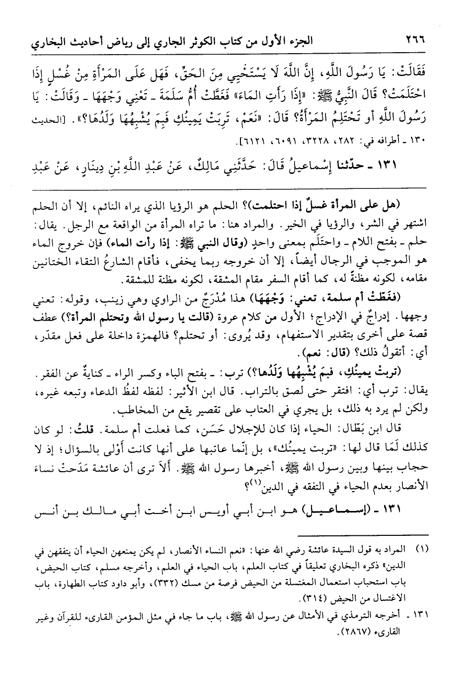 (فغَطّتْ أم سلمة، تعني: وَجْهَها) هذا مُدرَجٌ من الراوي وهي زينب، وقوله: تعني وجهها. إدراجٌ في الإدراج؛ الأول من كلام عروة (قالت يا رسول الله وتحتلم المرأة؟) عطف قصة على أخرى بتقدير الاستفهام، وقد يُروى: أو تحتلم؟ فالهمزة داخلة على فعل مقدّر، أي: أتقولُ ذلك؟ (قال: نعم).