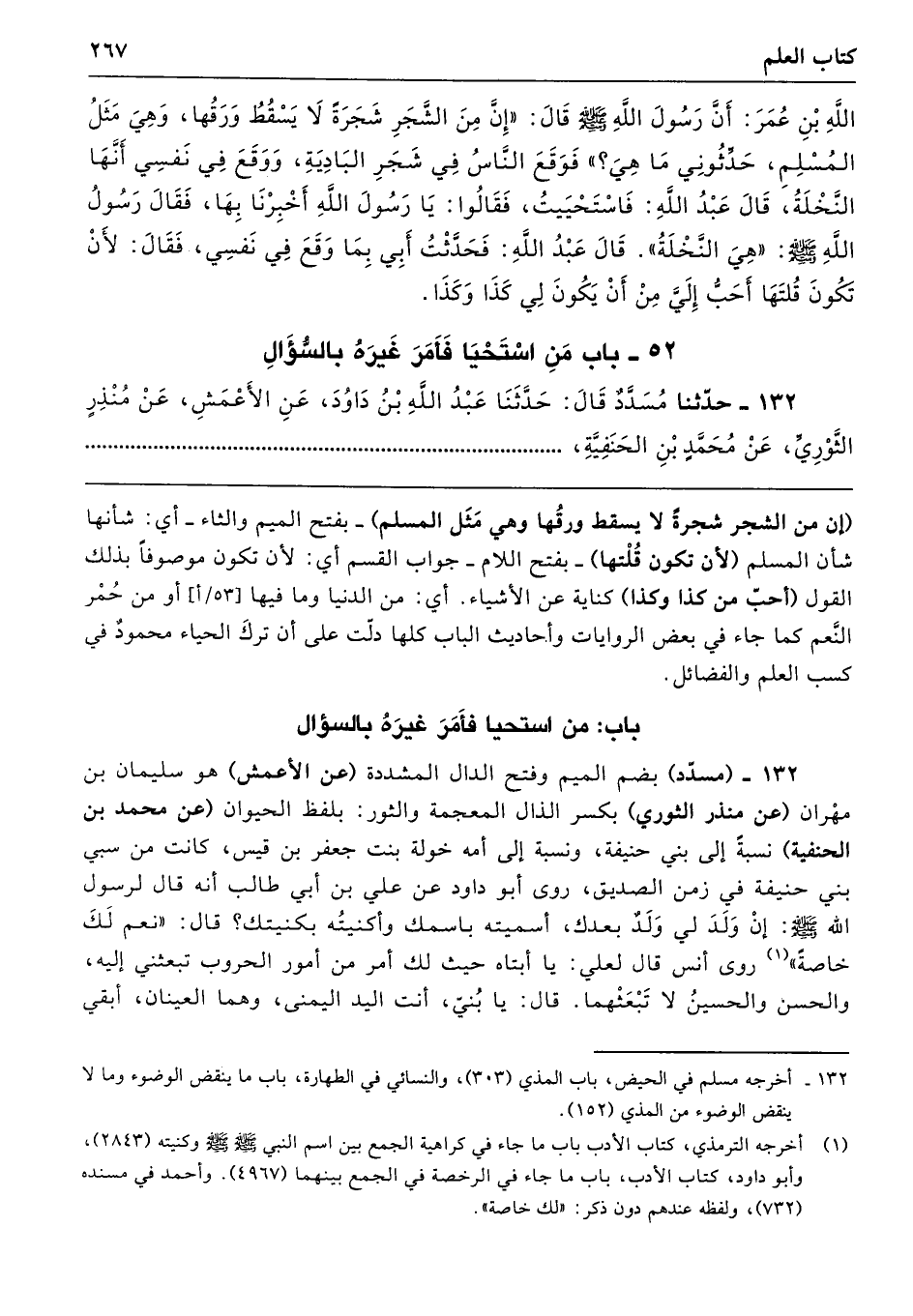 (إن من الشجر شجرةً لا يسقط ورقُها وهي مَثَل المسلم) -بفتح الميم والثاء- أي: شأنها شأن المسلم (لأن تكون قُلْتها) -بفتح اللام- جواب القسم أي: لأن تكون موصوفًا بذلك القول (أحبّ من كذا وكذا) كناية عن الأشياء. أي: من الدنيا وما فيها، أو من حُمْر النَّعم كما جاء في بعض الروايات وأحاديث الباب كلها دلّت على أن تركَ الحياء محمودٌ في كسب العلم والفضائل.