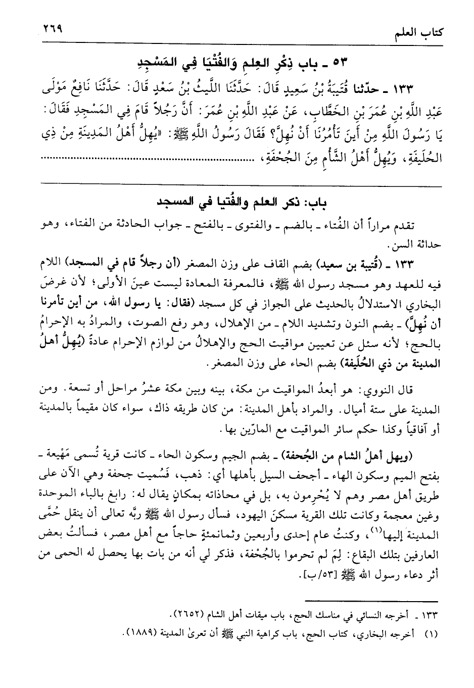 133 - (قُتيبة بن سعيد) بضم القاف على وزن المصغر (أن رجلًا قام في المسجد) اللام فيه للعهد وهو مسجد رسول الله -صلى الله عليه وسلم-، فالمعرفة المعادة ليست عينَ الأولى؛ لأن غرضَ البخاري الاستدلالُ بالحديث على الجواز في كل مسجد (فقال: يا رسول الله، من أين تأمرنا أن نُهِلَّ) -بضم النون وتشديد اللام- من الإهلال، وهو رفع الصوت، والمرادُ به الإحرامُ بالحج؛ لأنه سئل عن تعيين مواقيت الحج والإهلالُ من لوازم الإحرام عادة (يُهِلُّ أهلُ المدينة من ذي الحُلَيفة) بضم الحاء على وزن المصغر.