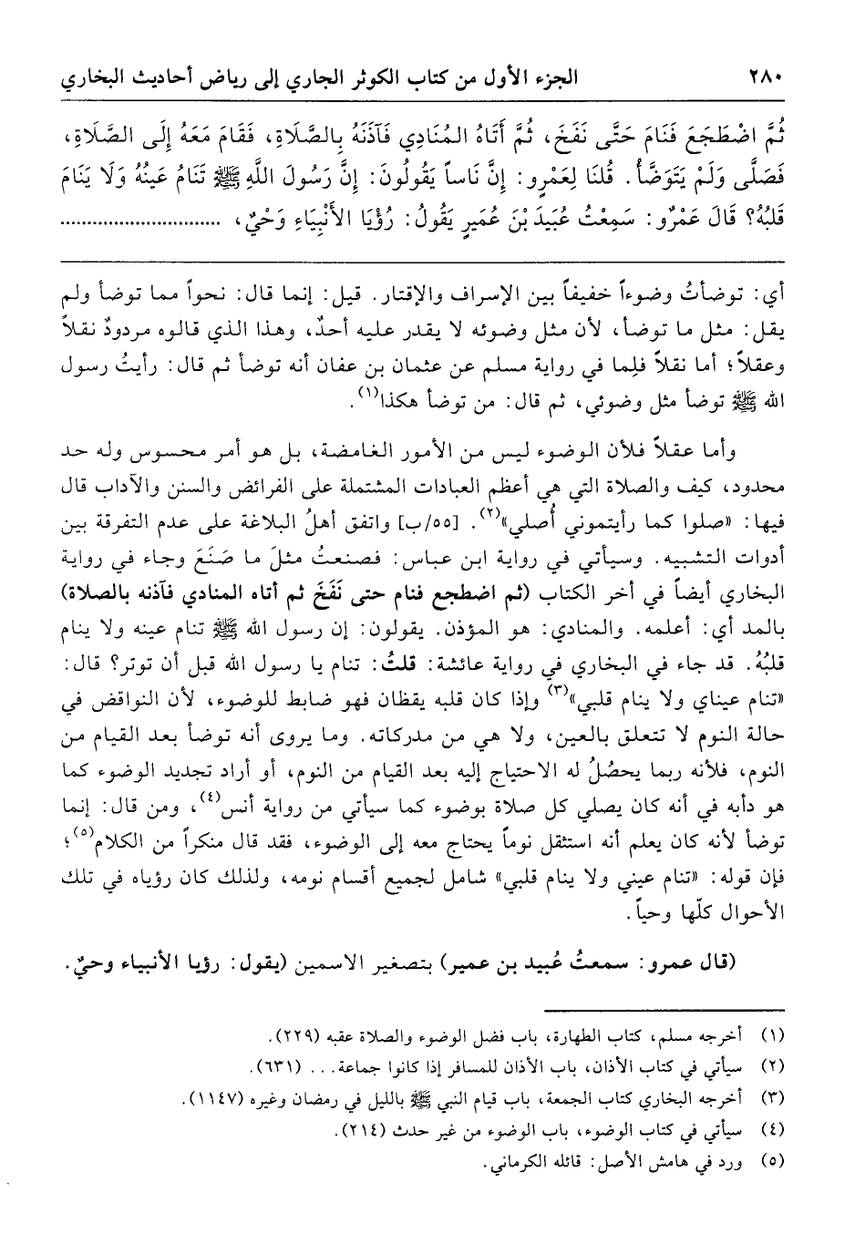 اضْطَجَعَ فَنَامَ حَتَّى نَفَخَ، ثُمَّ أَتَاهُ المُنَادِي فَآذَنَهُ بِالصَّلاَةِ، فَقَامَ مَعَهُ إِلَى الصَّلاَةِ، فَصَلَّى وَلَمْ يَتَوَضَّأْ» قُلْنَا لِعَمْرٍو إِنَّ نَاسًا يَقُولُونَ: «إِنَّ رَسُولَ اللَّهِ صَلَّى اللهُ عَلَيْهِ وَسَلَّمَ تَنَامُ عَيْنُهُ وَلاَ يَنَامُ قَلْبُهُ» قَالَ عَمْرٌو سَمِعْتُ عُبَيْدَ بْنَ عُمَيْرٍ يَقُولُ: "رُؤْيَا الأَنْبِيَاءِ وَحْيٌ،
