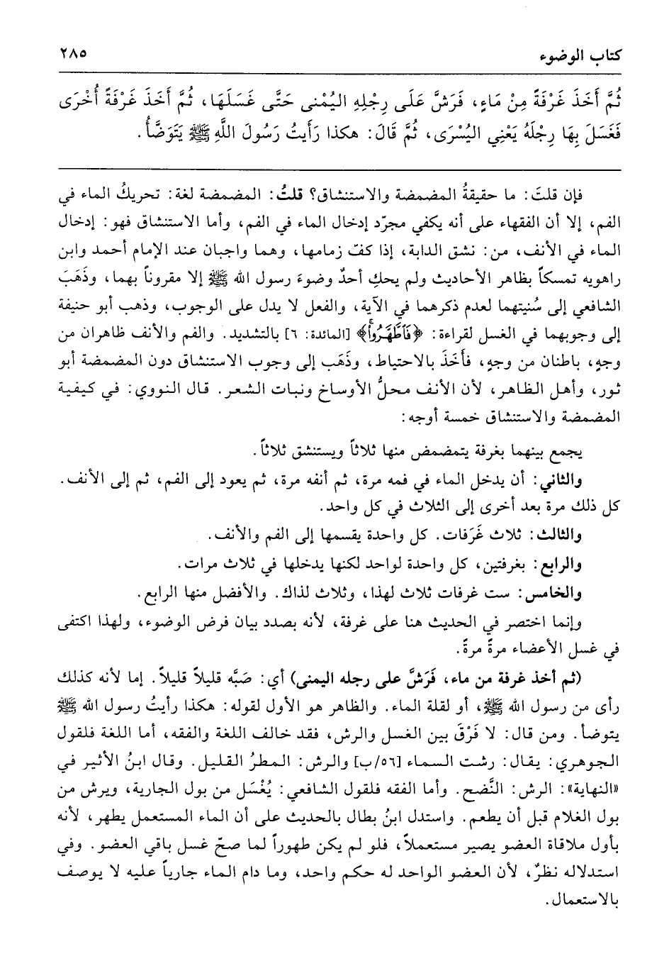 فإن قلتَ: ما حقيقةُ المضمضة والاستنشاق؟ قلتُ: المضمضة لغة: تحريكُ الماء في الفم، إلا أن الفقهاء على أنه يكفي مجرّد إدخال الماء في الفم، وأما الاستنشاق فهو: إدخال الماء في الأنف، من: نشق الدابة، إذا كفّ زمامها، وهما واجبان عند الإمام أحمد وابن راهويه تمسكًا بظاهر الأحاديث ولم يحكِ أحدٌ وضوءَ رسول الله -صلى الله عليه وسلم- إلا مقرونًا بهما، وذَهَبَ الشافعي إلى سُنيتهما لعدم ذكرهما في الآية، والفعل لا يدل على الوجوب، وذهب أبو حنيفة إلى وجوبهما في الغسل لقراءة: {فَاطَّهَّرُوا} [المائدة: 6]، بالتشديد. والفم والأنف ظاهران من وجهٍ، باطنان من وجهٍ، فأَخَذَ بالاحتياط، وذَهَب إلى وجوب الاستنشاق دون المضمضة أبو ثور، وأهل الظاهر، لأن الأنف محلّ الأوساخ ونبات الشعر. قال النووي: في كيفية المضمضة والاستنشاق خمسة أوجه: