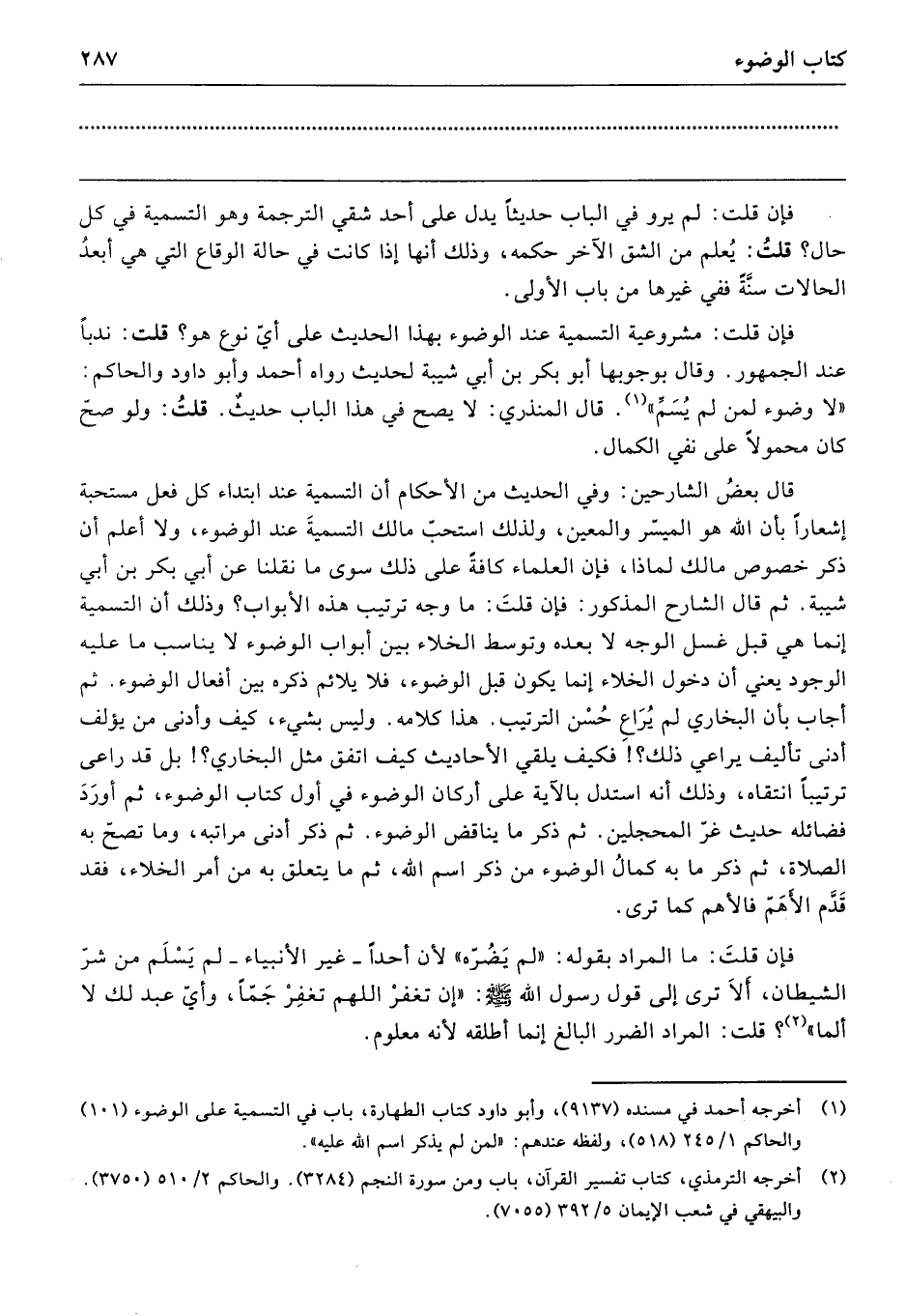 فإن قلت: مشروعية التسمية عند الوضوء بهذا الحديث على أيّ نوع هو؟ قلت: ندبًا عند الجمهور. وقال بوجوبها أبو بكر بن أبي شيبة لحديث رواه أحمد وأبو داود والحاكم: "لا وضوء لمن لم يُسَمِّ". قال المنذري: لا يصح في هذا الباب حديث. قلتُ: ولو صحّ كان محمولًا على نفي الكمال.