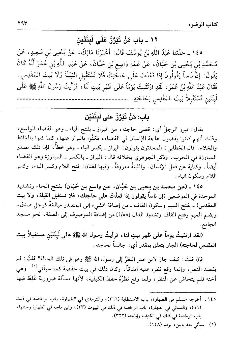 145 - (عن محمد بن يحيى بن حَبَّان، عن واسع بن حَبّان) بفتح الحاء وتشديد الموحدة في الموضعين (إن ناسًا يقولون إذا قعدْتَ على حاجتك، فلا تستقبل القبلة، ولا بيت المقدس) -بفتح الميم وسكون القاف- من إضافة الشيء إلى المصدر مبالغةً كرجل صدق، وبضم الميم وفتح القاف وتشديد الدال من إضافة الموصوف إلى الصفة، نحو مسجد الجامع.