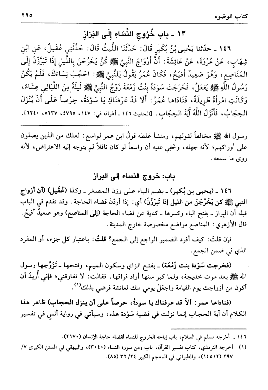 146 - حَدَّثَنَا يَحْيَى بْنُ بُكَيْرٍ، قَالَ: حَدَّثَنَا اللَّيْثُ، قَالَ: حَدَّثَنِي عُقَيْلٌ، عَنِ ابْنِ شِهَابٍ، عَنْ عُرْوَةَ، عَنْ عَائِشَةَ، أَنَّ أَزْوَاجَ النَّبِيّ صَلَّى اللهُ عَلَيْهِ وَسَلَّمَ كُنَّ يَخْرُجْنَ بِاللَّيْلِ إِذَا تَبَرَّزْنَ إِلَى المَنَاصِعِ وَهُوَ صَعِيدٌ أَفْيَحُ " فَكَانَ عُمَرُ يَقُولُ لِلنَّبِيِّ صَلَّى اللهُ عَلَيْهِ وَسَلَّمَ: احْجُبْ نِسَاءَكَ، فَلَمْ يَكُنْ رَسُولُ اللَّهِ صَلَّى اللهُ عَلَيْهِ وَسَلَّمَ يَفْعَلُ "، فَخَرَجَتْ سَوْدَةُ بِنْتُ زَمْعَةَ، زَوْجُ النَّبِيِّ صَلَّى اللهُ عَلَيْهِ وَسَلَّمَ، لَيْلَةً مِنَ اللَّيَالِي عِشَاءً، وَكَانَتِ امْرَأَةً طَوِيلَةً، فَنَادَاهَا عُمَرُ: أَلاَ قَدْ عَرَفْنَاكِ يَا سَوْدَةُ، حِرْصًا عَلَى أَنْ يَنْزِلَ الحِجَابُ، فَأَنْزَلَ اللَّهُ آيَةَ الحِجَابِ [الحديث 146 - أطرافه في: 147، 4795، 5237، 6240].