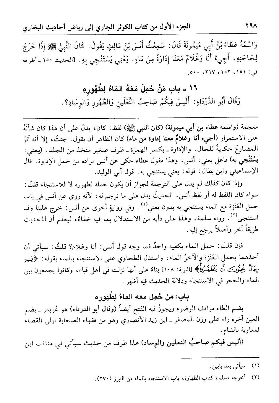 فإن قلتَ: حمل الماء يكفيه واحدٌ فما وجه قول أنسى: أنا وغلام؟ قلتُ: سيأتي أن أحدهما يحمل العَنَزة والآخرُ الماء، واستدل الطحاوي على الاستنجاء بالماء بقوله: {فِيهِ رِجَالٌ يُحِبُّونَ أَنْ يَتَطَهَّرُوا} [التوبة: 108] بناءً على أنها نزلت في أهل قباء، وكانوا يجمعون بين الماء والحجر في الاستنجاء ودلالة الحديث فيه أظهر.