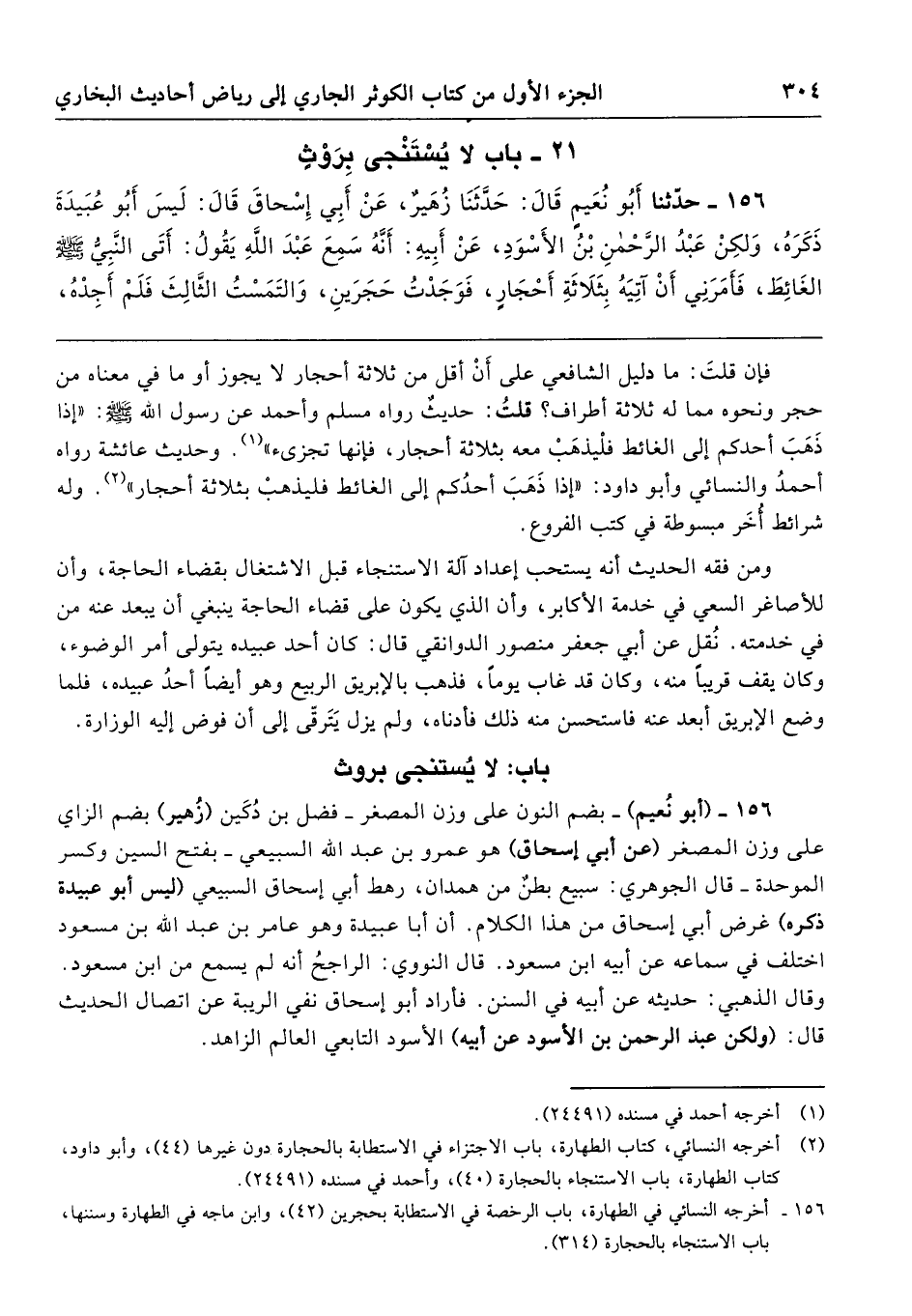 156 - (أبو نُعيم) -بضم النون على وزن المصغر- فضل بن دُكَين (زُهير) بضم الزاي على وزن المصغر (عن أبي إسحاق) هو عمرو بن عبد الله السبيعي -بفتح السين وكسر الموحدة- قال الجوهري: سبيع بطنٌ من همدان، رهط أبي إسحاق السبيعي (ليس أبو عبيدة ذكره) غرض أبي إسحاق من هذا الكلام. أن أبا عبيدة وهو عامر بن عبد الله بن مسعود اختلف في سماعه عن أبيه ابن مسعود. قال النووي: الراجحُ أنه لم يسمع من ابن مسعود. وقال الذهبي: حديثه عن أبيه في السنن. فأراد أبو إسحاق نفي الريبة عن اتصال الحديث قال: (ولكن عبد الرحمن بن الأسود عن أبيه) الأسود التابعي العالم الزاهد.