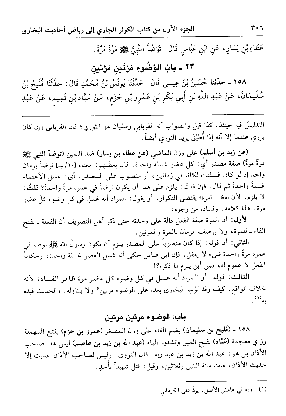 الثالث: قوله: أو المراد أنه غسل في كل وضوء كل عضو مرة ظاهر الفساد؛ لأنه خلاف الواقع. كيف وقد بَوَّب البخاري بعده على الوضوء مرتين؟ ولا يتناوله. والحديث قيده به.