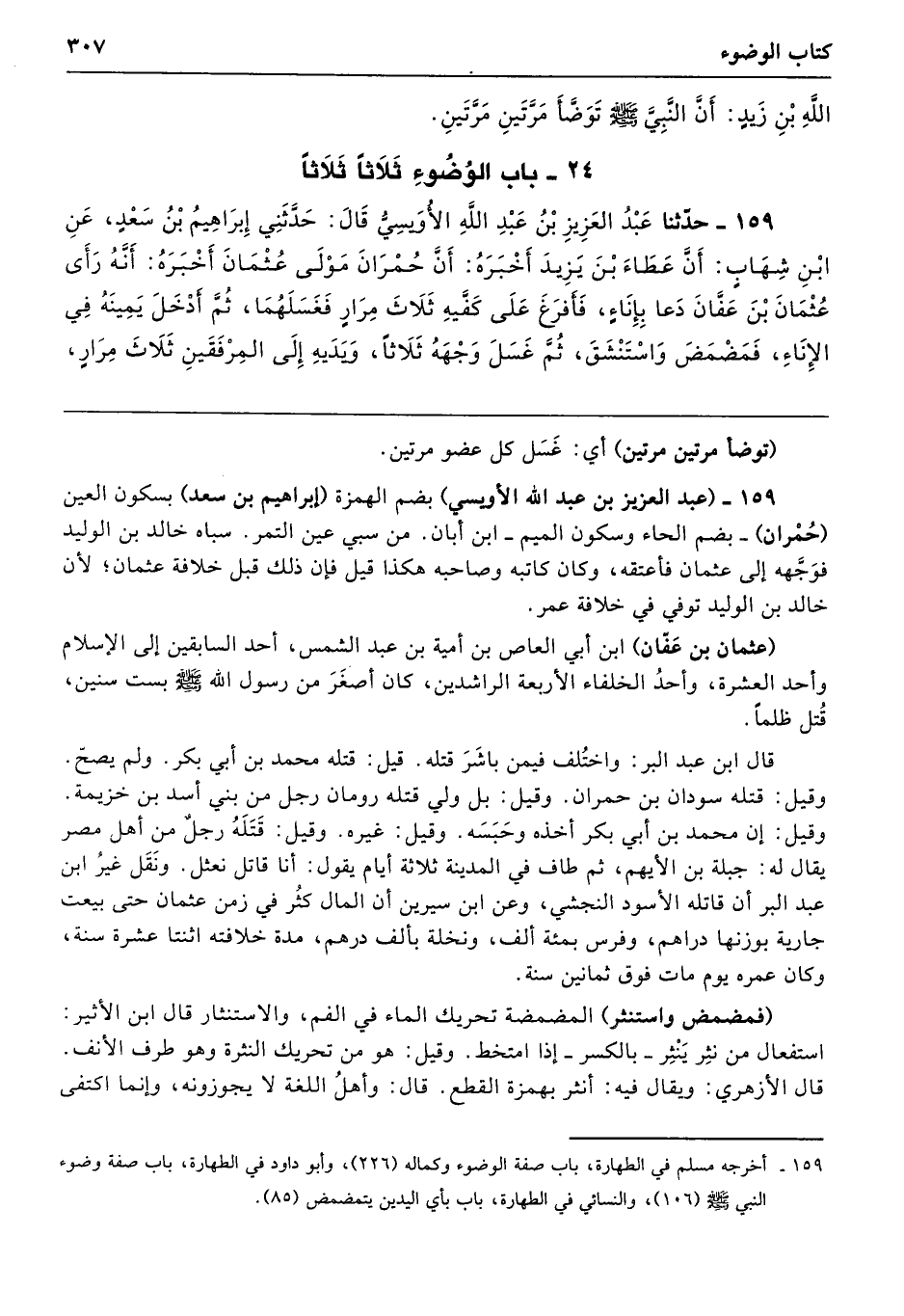 159 - (عبد العزيز بن عبد الله الأويسي) بضم الهمزة (إبراهيم بن سعد) بسكون العين (حُمْران) -بضم الحاء وسكون الميم- ابن أبان. من سبي عين التمر. سباه خالد بن الوليد فوَجَّهه إلى عثمان فأعتقه، وكان كاتبه وصاحبه هكذا قيل فإن ذلك قبل خلافة عثمان؛ لأن خالد بن الوليد توفي في خلافة عمر.