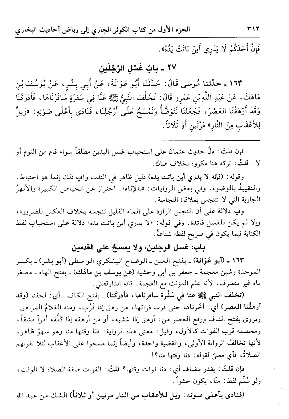163 - حَدَّثَنَا مُوسَى قَالَ حَدَّثَنَا أَبُو عَوَانَةَ عَنْ أَبِى بِشْرٍ عَنْ يُوسُفَ بْنِ مَاهَكَ عَنْ عَبْدِ اللَّهِ بْنِ عَمْرٍو قَالَ تَخَلَّفَ النَّبِىُّ - صلى الله عليه وسلم - عَنَّا فِي سَفْرَةٍ سَافَرْنَاهَا، فَأَدْرَكَنَا وَقَدْ أَرْهَقْنَا الْعَصْرَ، فَجَعَلْنَا نَتَوَضَّأُ وَنَمْسَحُ عَلَى أَرْجُلِنَا، فَنَادَى بِأَعْلَى صَوْتِهِ «وَيْلٌ لِلأَعْقَابِ مِنَ النَّارِ». مَرَّتَيْنِ أَوْ ثَلاَثًا.